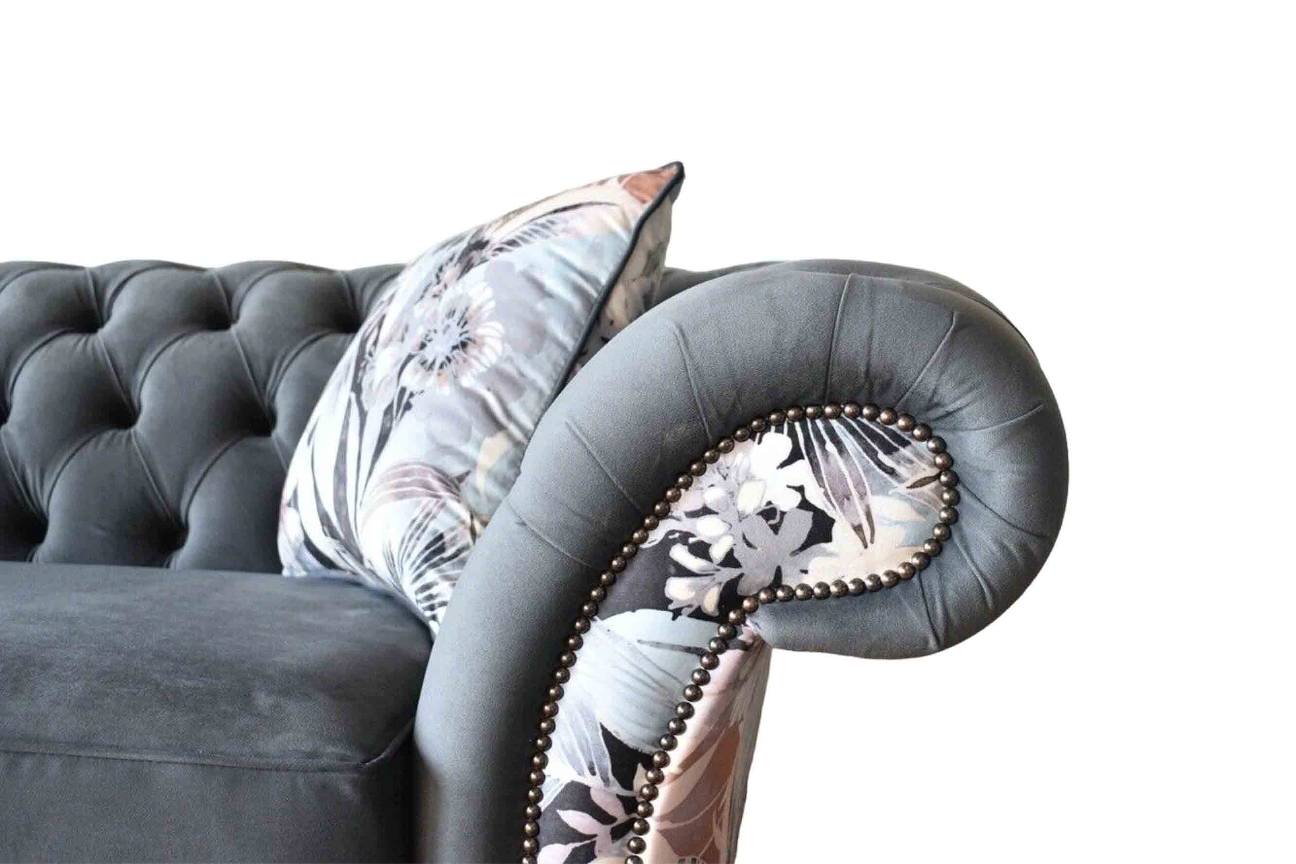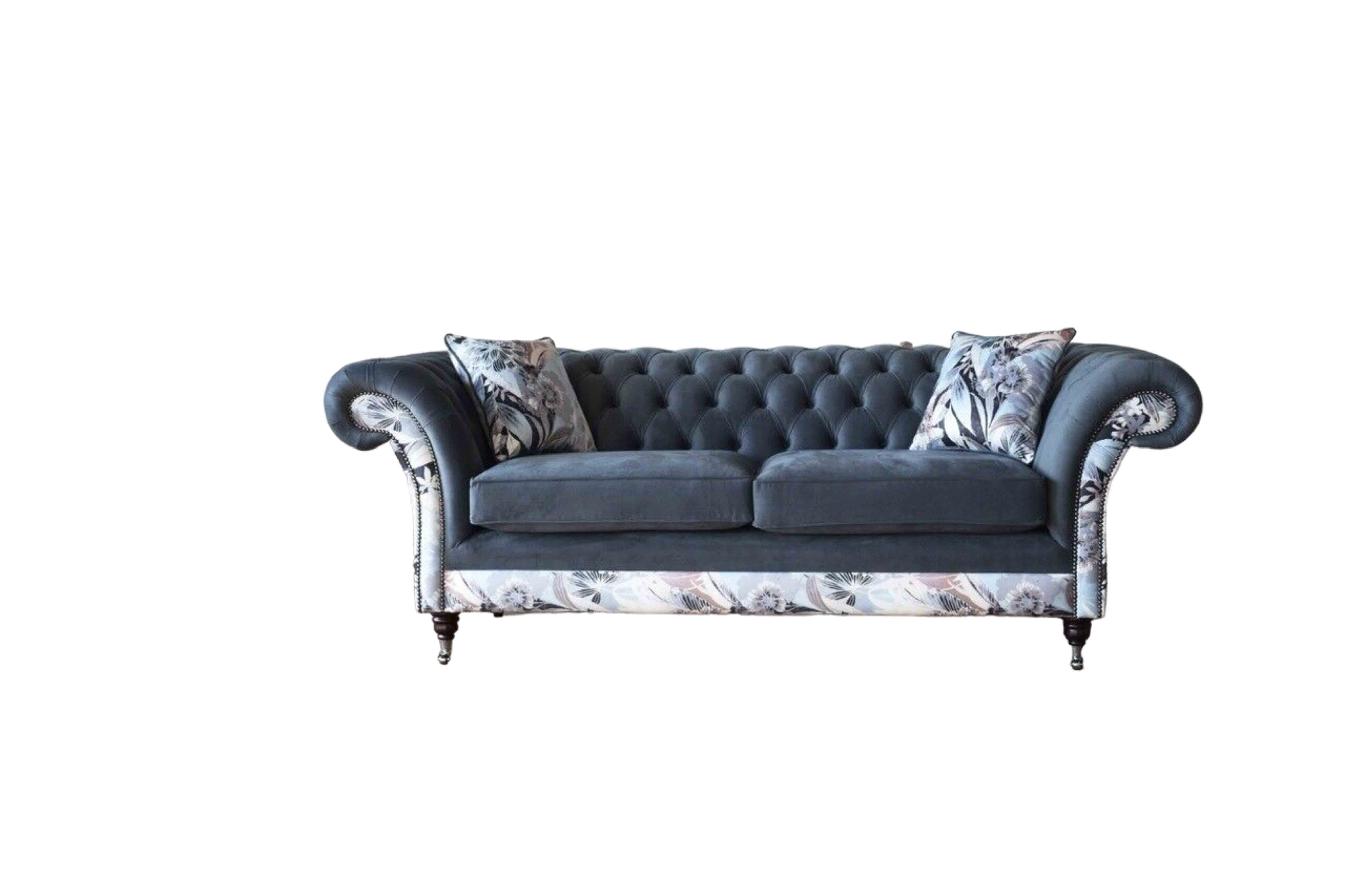 Entdecken Sie das auffällige Dreisitzer-Sofa im edlen Chesterfield-Design mit einer zarten grauen Blumendekoration. Dieses weiche Sofa ist nicht nur ein Blickfang, sondern auch äußerst komfortabel und in verschiedenen Farben erhältlich. Wählen Sie aus einer Vielzahl an Farbtönen wie Taubengrau, Zementgrau, Lavendelgrau und vielen mehr. Hergestellt aus hochwertigem Textilmaterial, kann dieses Sofa optional gegen einen Aufpreis von 699 Euro auch mit 100% Vollleder bezogen werden. Die Bettfunktion mit Matratze ist ebenfalls möglich und kann vor dem Kauf angefragt werden. Darüber hinaus bieten wir verschiedene Materialgruppen wie Premium Leder, Premium-Samtstoff und Magic Home (schmutzabweisender Stoff) an, um Ihren individuellen Wünschen gerecht zu werden. Sondergrößen wie 5-Sitzer, 4-Sitzer, 3-Sitzer, 2-Sitzer und 1-Sitzer sind ebenfalls erhältlich, ebenso wie Maßanfertigungen. Dieses exklusive Sofa verfügt über ein Innenrahmen aus Naturholz und hochwertiges Rindsleder aus Italien. Kristallsteine können optional anstelle von Knöpfen gewählt werden, und sogar echte Swarovski-Kristallsteine sind auf Anfrage erhältlich. Erwerben Sie jetzt dieses einzigartige Dreisitzer-Sofa und verwandeln Sie Ihr Zuhause in eine luxuriöse Wohlfühloase!