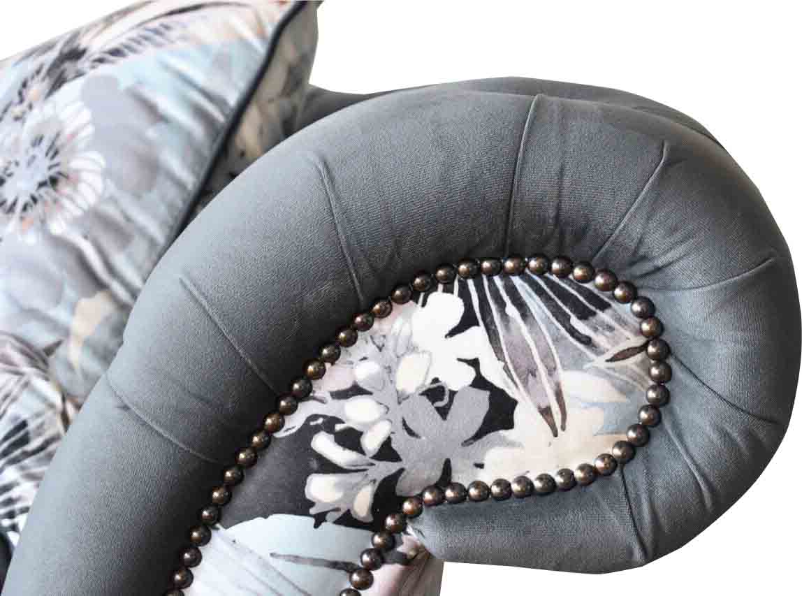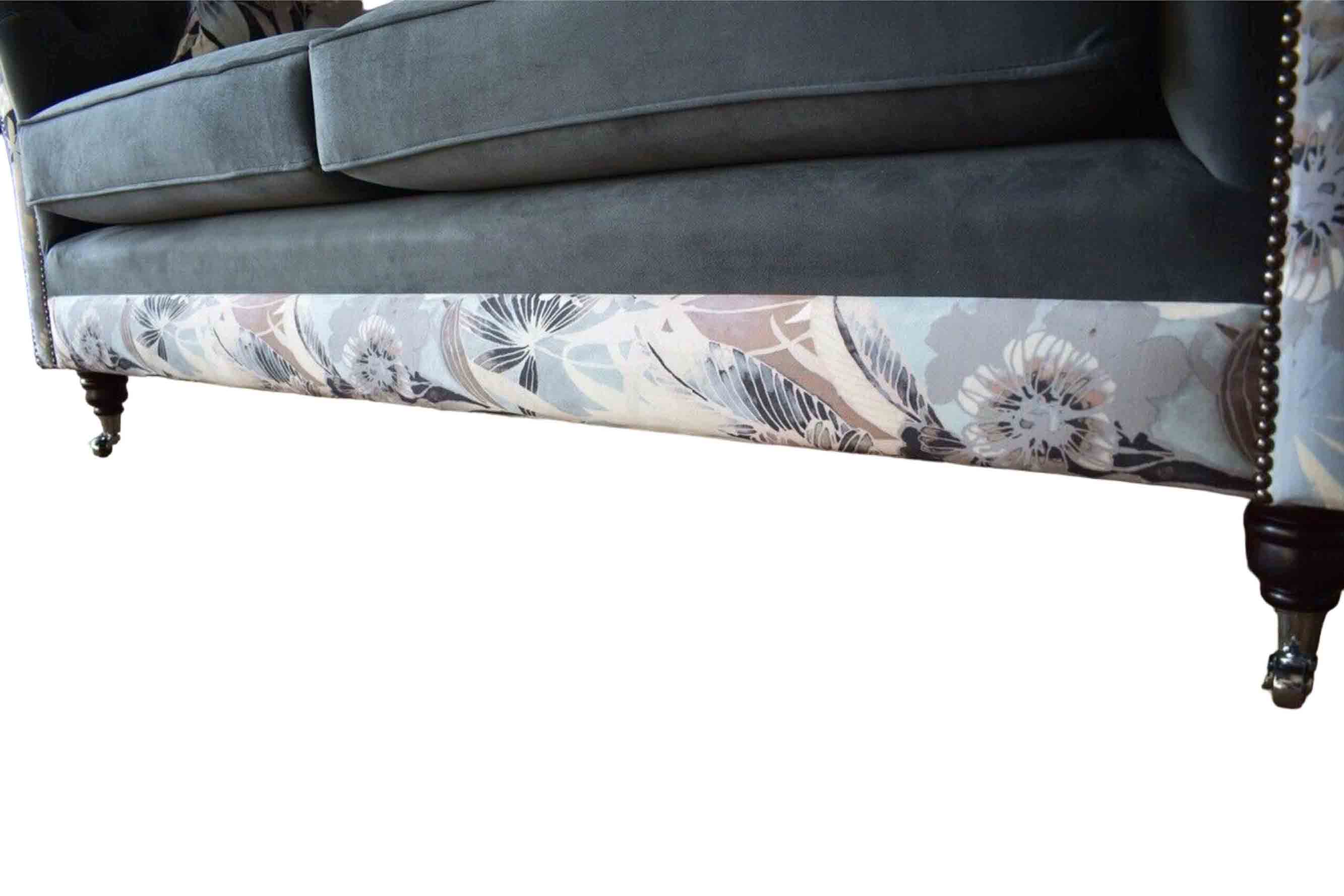 Ein auffälliges Dreisitzer-Sofa im Chesterfield-Design mit zarter grauer Blumendekoration