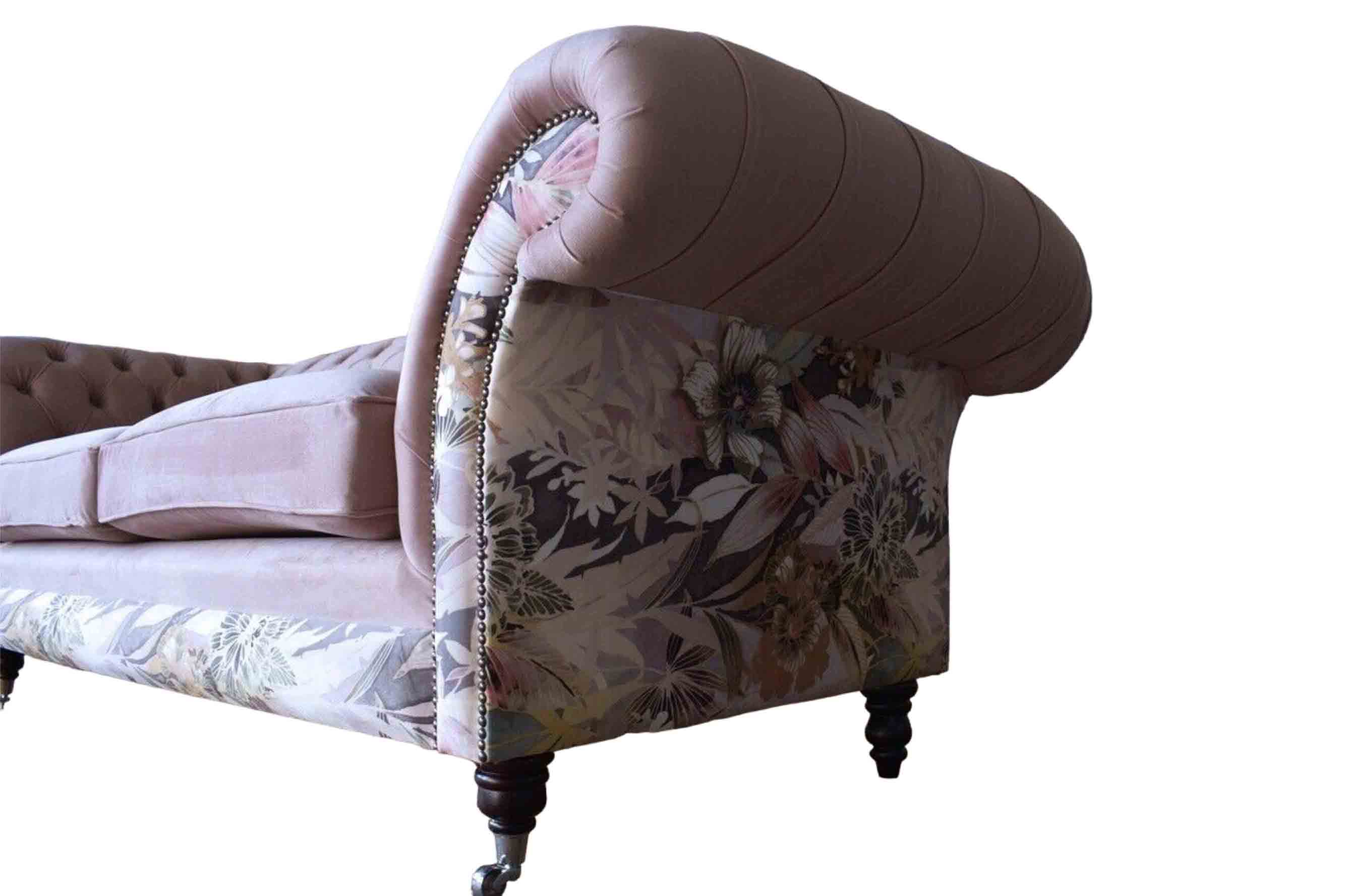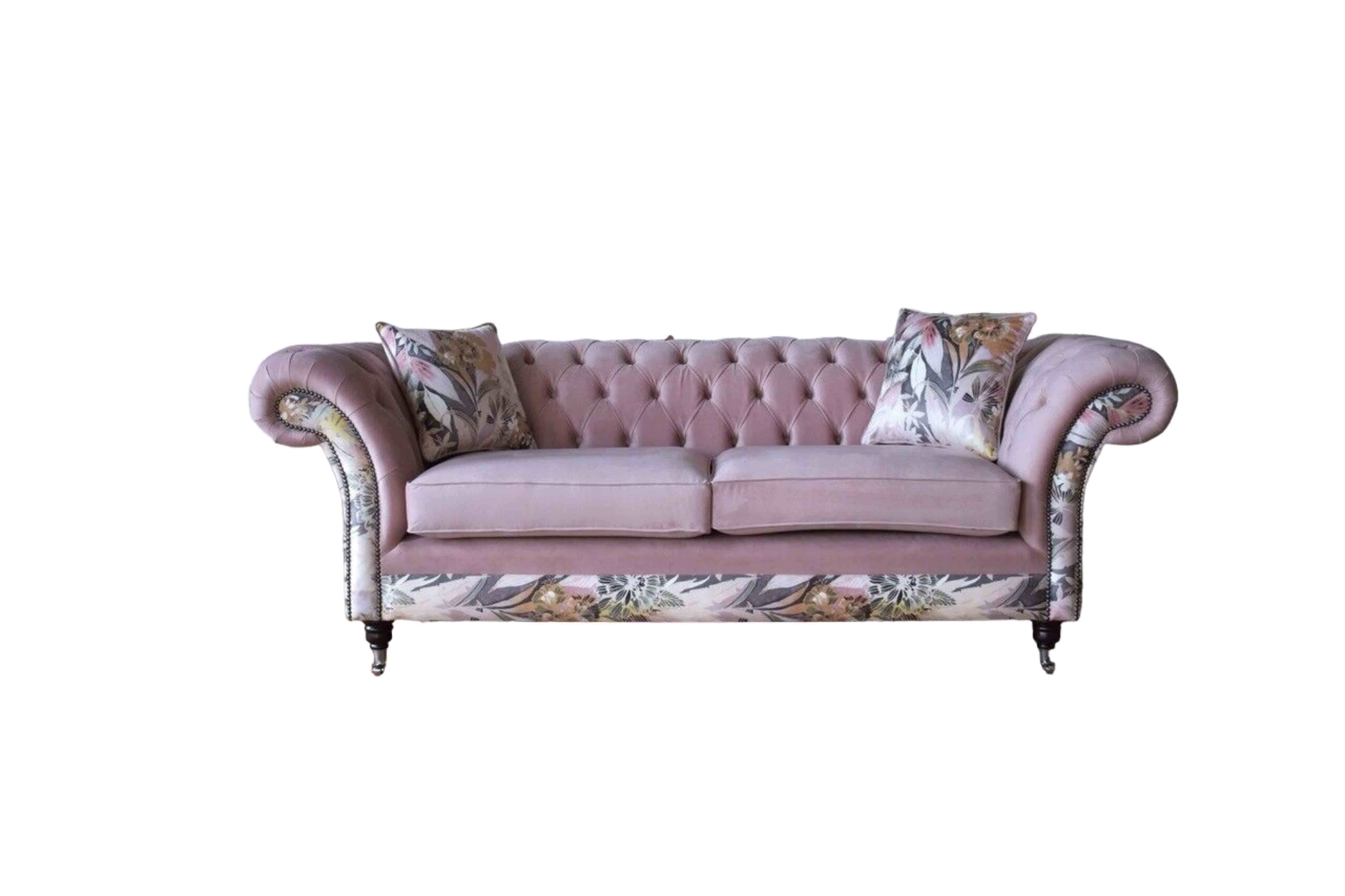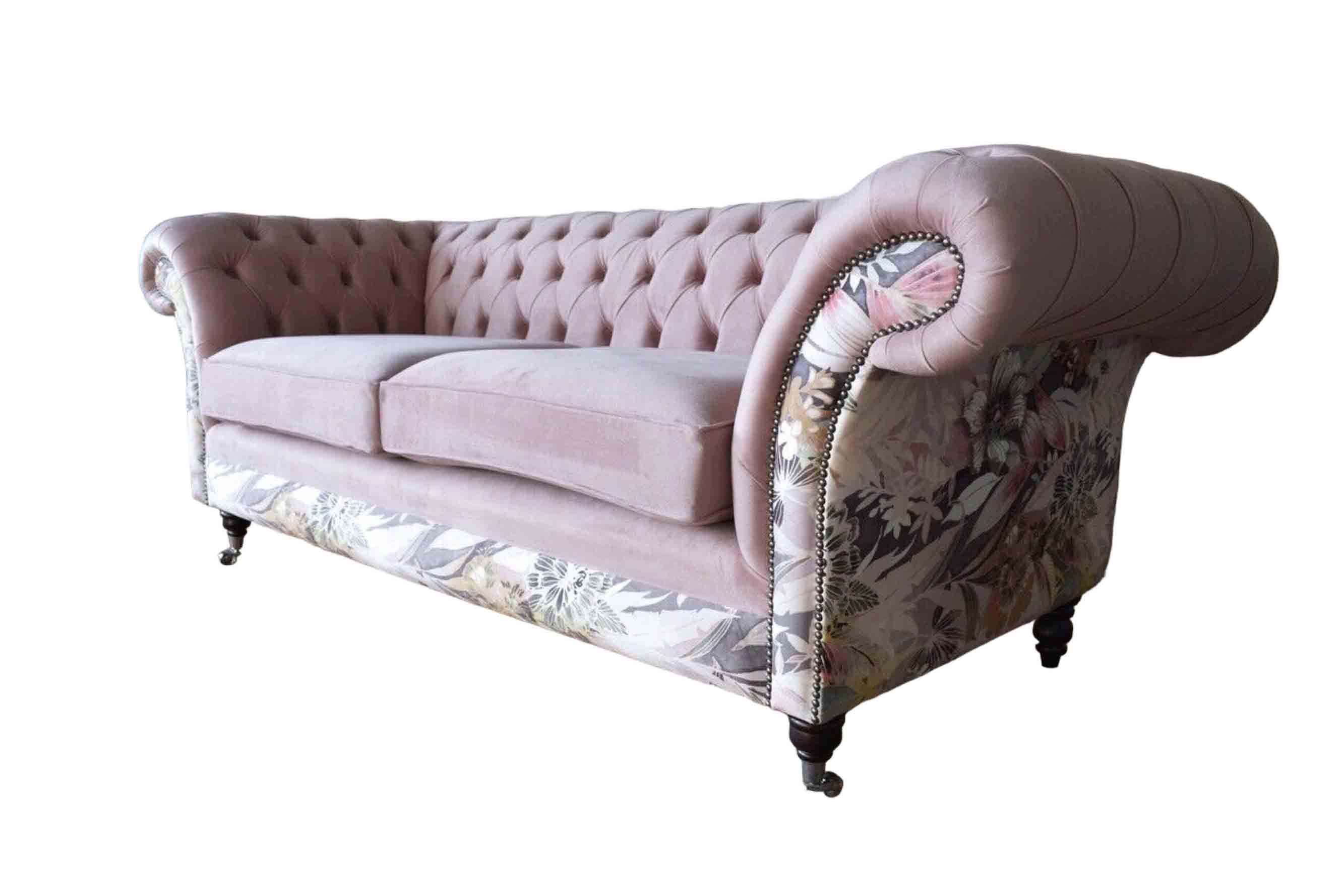 Ein lebhaftes Dreisitzer-Sofa aus Chesterfield mit zartem rosa Blumenmuster