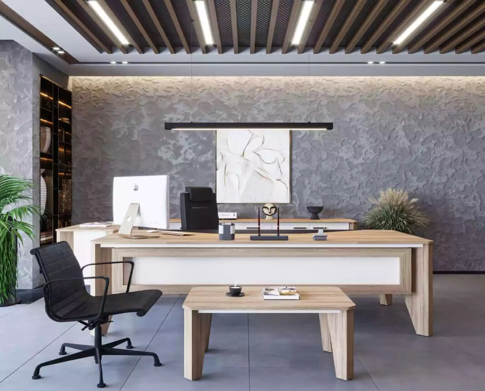 Entdecken Sie die perfekte Büromöbel Einrichtung mit unserem 3-teiligen Set bestehend aus einem Schreibtisch, einem Aktenschrank und einem Couchtisch. Hergestellt aus hochwertigem Holz und in der Farbe, wie abgebildet, wird dieses Set Ihrem Büro einen eleganten Touch verleihen. Der Schreibtisch hat die Maße ca. 200 x 100 x 75 cm und bietet Ihnen genügend Platz, um effizient zu arbeiten. Der Couchtisch mit ca. 85 x 53 x 45 cm ist ideal für Besprechungen oder entspannte Kaffeepausen. Der Aktenschrank mit ca. 221 x 53 x 75 cm bietet viel Stauraum für Ihre Unterlagen. Schaffen Sie mit B2B Moebel eine inspirierende Arbeitsumgebung und steigern Sie Ihre Produktivität! Bestellen Sie jetzt und gestalten Sie Ihr Büro neu.