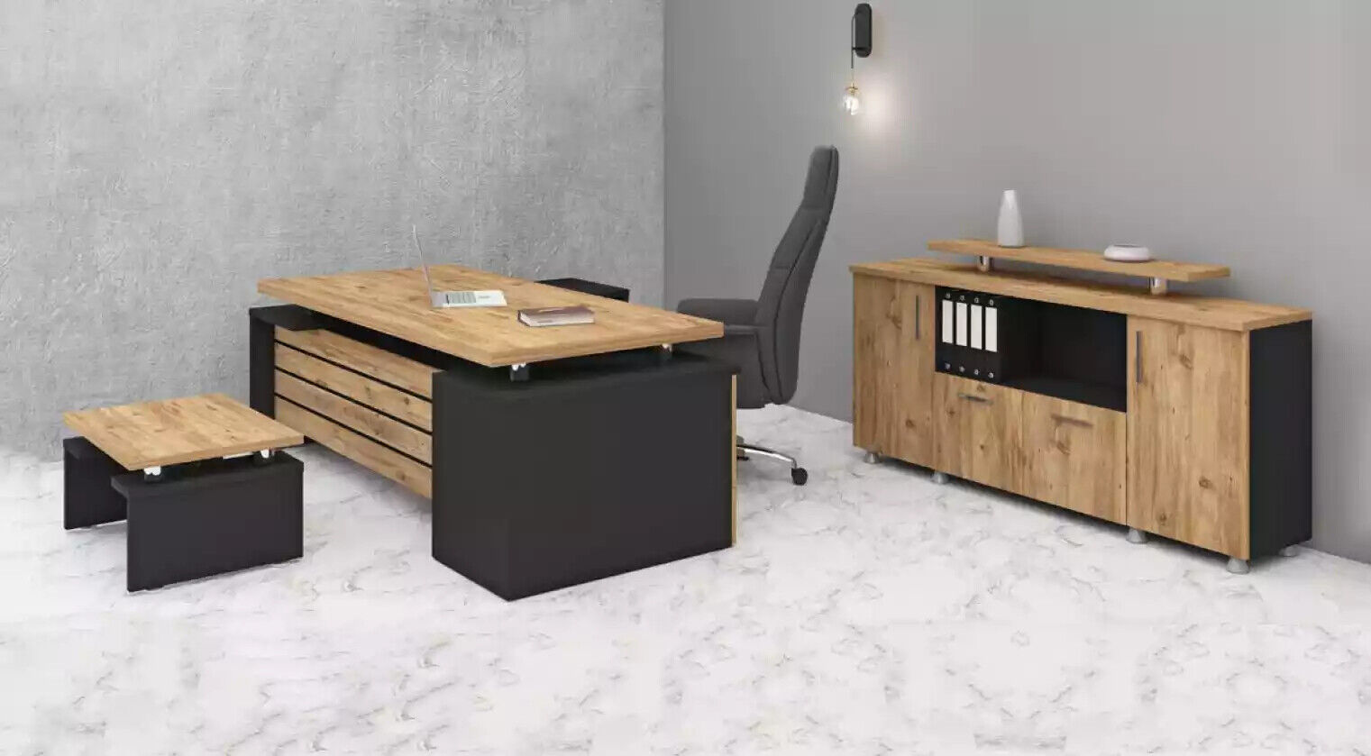 Arbeiten Sie stilvoll und luxuriös mit diesem modernen 3-teiligen Designer Büromöbel Luxus Arbeitszimmer Set. Das Set besteht aus einem geräumigen Eckschreibtisch, einem eleganten Couchtisch und einem praktischen Schrank, die alle aus hochwertigem Holz gefertigt sind. Die Maße sind perfekt für Ihr Arbeitszimmer: Der Eckschreibtisch misst ca. 220 x 160 x 75 cm, der Couchtisch ca. 80 x 55 x 45 cm und der Schrank ca. 180 x 40 x 91 cm. Gönnen Sie sich das Beste für Ihr Arbeitsumfeld und schaffen Sie eine inspirierende Atmosphäre in Ihrem Büro. Erhältlich in der abgebildeten Farbe - bestellen Sie jetzt Ihr modernes Designer Büromöbel Luxus Arbeitszimmer Set!