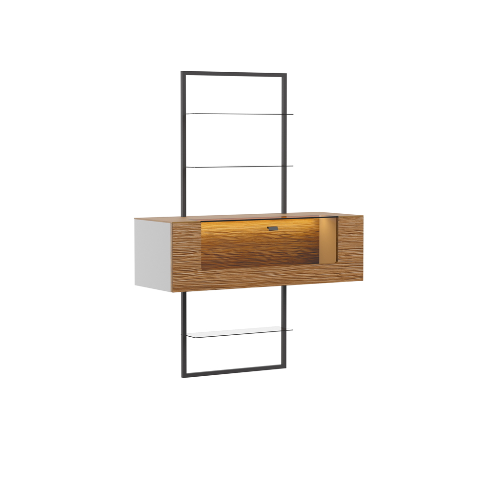 Rückwand & Einlegeböden: MDF (Mitteldichte Holzfaserplatte), furniert & lackiert
