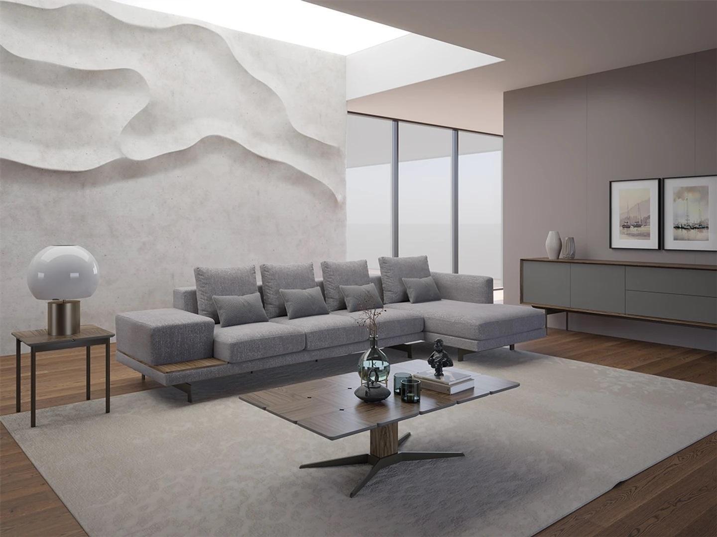 Verwandeln Sie Ihr Wohnzimmer in eine stilvolle Wohlfühloase mit diesem modernen Ecksofa in L-Form. In einem eleganten Grau gehalten, bietet dieses Designer-Polstermöbel viel Platz und Komfort. Mit einer beeindruckenden Länge von ca. 345 cm und einer Breite von ca. 159 cm fügt sich das Sofa harmonisch in jeden Raum ein. Die Sitzhöhe von ca. 42 cm und die Sitztiefe von ca. 54 cm sorgen für optimalen Sitzkomfort. Der passende Couchtisch (ca. 125 x 75 x 38 cm) und der Beistelltisch (ca. 50 x 50 x 51 cm) aus Holz mit Textil runden das Ensemble perfekt ab. Gönnen Sie sich Luxus und Design für Ihr Zuhause