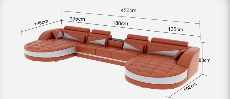 Entdecken Sie das moderne Design U-Form Ecksofa für ein stilvolles Wohnzimmer! Mit XL Möbel können Sie sich eine weiche Eckcouch in einer U-Form sichern. Dieses Ecksofa bietet nicht nur Komfort, sondern auch Stil. Mit Maßen von ca. 198 x 450 x 198 cm und einer Höhe von ca. 88 cm ist dieses Möbelstück perfekt für Ihr Zuhause. Die Sitzhöhe beträgt ca. 42 cm, die Tiefe ca. 98 cm und die Sitztiefe ca. 58 cm. Das Ecksofa verfügt über eine USB-Klickautomatik mit 3-fachem Steckplatz, die bereits im Preis enthalten ist. Sie haben die Freiheit, die Farbe selbst auszuwählen. Wählen Sie aus einer Vielzahl von Farben wie Zyan, Kirschrot, Schwarz und vielen mehr. Der Bezug besteht aus Premium Lederfaserstoff (70% Leder / 30% Polyester). Optional können Sie zwischen verschiedenen Materialgruppen wie Premium Echtleder oder Premium Textilstoff wählen. Möchten Sie Ihr Sofa aufwerten? Kein Problem! Wählen Sie aus verschiedenen Optionen wie einer elektrischen Relax-Fußstütze, einem Soundsystem mit Sound Boxen und USB- sowie Bluetooth-System, oder einer Unterbodenbeleuchtung mit Fernbedienung. Das Innengestell besteht aus echtem Holz und das italienische Rindsleder sorgt für hochwertigen Komfort. Dieses stilvolle Ecksofa wird Ihre Gäste beeindrucken und Ihrem Wohnzimmer eine elegante Note verleihen. Gönnen Sie sich jetzt diese einzigartige Ergänzung für Ihr Zuhause!