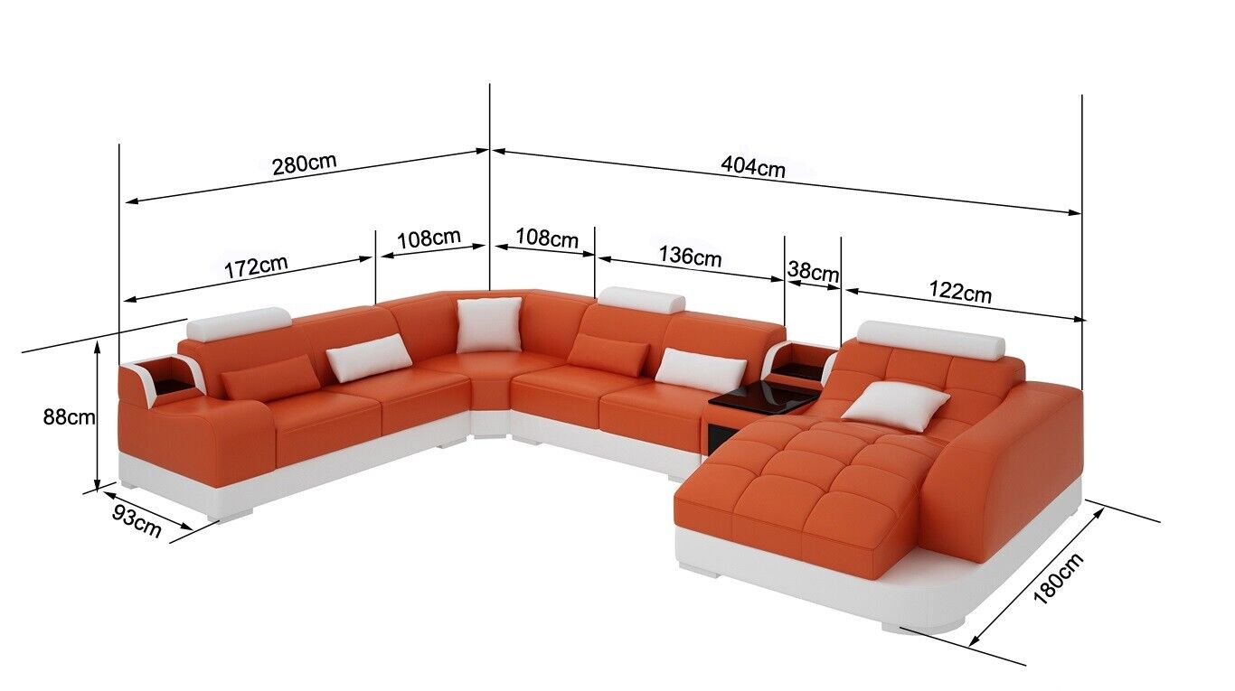 Entdecken Sie das Ledersofa Designer Sofa U Form Wohnlandschaft Couch Polster Ecksofa für ein luxuriöses Wohnzimmer! Hergestellt aus hochwertigem Premium Lederfaserstoff, bietet dieses Ecksofa in U-Form mit seinen Maßen von ca. 280 x 404 x 180 cm oder 180 x 404 x 280 cm ausreichend Platz für entspannte Stunden. Die Sitzhöhe von ca. 44 cm und die Sitztiefe von ca. 60 cm sorgen für optimalen Komfort. Sie haben die freie Wahl bei der Farbe - von Zyan bis Schwarz, von Burgunderrot bis Silber steht Ihnen eine Vielzahl an Farboptionen zur Verfügung. Optional können Sie auch zwischen verschiedenen Materialgruppen wählen, darunter Premium Echtleder und Premium Textilstoff. Das Ledersofa besticht nicht nur durch sein exklusives Design, sondern auch durch seine hochwertige Verarbeitung. Der Korpus aus echtem Holz garantiert Stabilität und Langlebigkeit. Schaffen Sie mit diesem Designer Sofa eine einladende Atmosphäre in Ihrem Zuhause und gönnen Sie sich den Luxus und Komfort, den Sie verdienen!