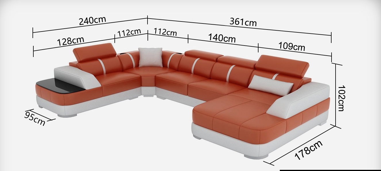 Erleben Sie Luxus und Komfort mit unserem Ledersofa Polster Sitz Eck Sofa Garnitur Wohnlandschaft! Dieses Ecksofa in U-Form bietet nicht nur eine elegante Optik, sondern auch eine praktische USB-Klickautomatik mit 3-fach Steckplatz. Mit Maßen von ca. 178 x 361 x 240 cm oder 240 x 361 x 178 cm und einer Höhe von ca. 102 cm bietet dieses Sofa genügend Platz zum Entspannen. Wählen Sie aus einer Vielzahl von Farben, darunter Zyan, Weinrot, Anthrazit und viele mehr. Das Premium Lederfaserstoffmaterial (70% Leder / 30% Polyester) sorgt für Langlebigkeit und Stil. Optional können Sie zwischen verschiedenen Materialgruppen wählen, wie Premium Echtleder oder Textilstoff. Personalisieren Sie Ihr Sofa mit zusätzlichen Optionen wie einer elektrischen Relax-Fußstütze, einem Becherhalter mit Kühlsystem, einem Soundsystem mit Bluetooth und USB, oder einer Unterbodenbeleuchtung mit Fernbedienung. Hergestellt aus italienischem Rindsleder und echtem Holzgestell mit Federkern garantiert dieses Sofa Qualität und Komfort. Gönnen Sie sich dieses exklusive Ledersofa und verwandeln Sie Ihr Wohnzimmer in eine stilvolle Wohlfühloase!