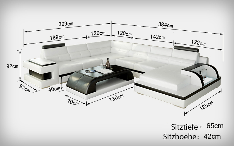 Erwerben Sie jetzt die Luxus Polster Sitz Leder Eck Couch mit USB Sofa Wohn Möbel Landschaft Garnitur von XL Möbel! Dieses weiche Ecksofa in U-Form besticht nicht nur durch sein exklusives Design, sondern auch durch seine Funktionalitäten. Mit einer Größe von ca. 309 x 384 x 185 cm oder ca. 185 x 384 x 309 cm und einer Höhe von ca. 92 cm bietet es genügend Platz zum Entspannen. Das Highlight dieses Sofas ist der USB-Klickautomatik mit 3-fachem Steckplatz, der bereits INKLUSIVE ist. Wählen Sie aus einer Vielzahl von Farben Ihren Favoriten und passen Sie das Sofa an Ihren Wohnstil an. Das Material besteht aus hochwertigem Premium Lederfaserstoff (70% Leder / 30% Polyester), optional können Sie auch zwischen verschiedenen Lederarten und Textilstoffen wählen. Außerdem haben Sie die Möglichkeit, das Sofa nach Ihren Wünschen zu individualisieren. Entdecken Sie im Shop Optionen wie die elektrische Relax-Fußstütze, Becherhalter mit Kühlsystem, Soundsystem mit Sound Boxen und Bluetooth, sowie Unterbodenbeleuchtung mit Fernbedienung für einen modernen Look. Die Luxus Polster Sitz Eck Couch mit USB Sofa überzeugt nicht nur durch ihr Design, sondern auch durch ihre hochwertige Verarbeitung. Das Innengestell aus echtem Holz mit Federkern und das italienische Rindsleder sorgen für Langlebigkeit und Komfort. Sichern Sie sich jetzt Ihr Traumsofa und machen Sie Ihr Wohnzimmer zu einer echten Wohlfühloase!