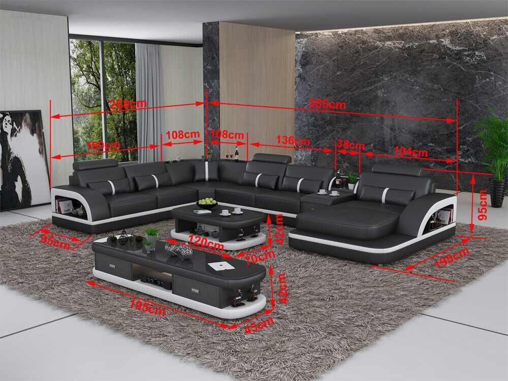 Erleben Sie Luxus und Komfort mit unserem Ledersofa Ecksofa Garnitur Polster U Form Couch Sofa Design Eckgarnitur! Dieses beeindruckende Ecksofa wird Ihr Wohnzimmer in eine stilvolle Oase verwandeln. Hergestellt aus hochwertigem Premium Lederfaserstoff (70% Leder / 30% Polyester) bietet dieses Sofa nicht nur erstklassigen Sitzkomfort, sondern auch eine edle Optik. Mit XL Möbel haben Sie die Möglichkeit, die Farbe des Sofas ganz nach Ihrem Geschmack zu wählen. Ob klassisch in Schwarz oder Weiß, oder doch lieber in einem kräftigen Ton wie Rubinrot, Fuchsia oder Kupfer - die Auswahl an Farben ist riesig. Darüber hinaus können Sie auch zwischen verschiedenen Materialoptionen wie Premium Echtleder, Premium Textilstoff oder Premium Vollleder wählen, um das Sofa Ihren individuellen Wünschen anzupassen. Die Maße des Ecksofas betragen ca. 268 x 386 x 195 cm oder 195 x 386 x 268 cm und bieten genügend Platz zum Entspannen und Geselligkeit genießen. Das Innengestell aus echtem Holz sorgt zudem für Stabilität und Langlebigkeit. Entdecken Sie jetzt das Ledersofa Ecksofa Garnitur Polster U Form Couch Sofa Design Eckgarnitur und geben Sie Ihrem Wohnzimmer einen Hauch von Eleganz!