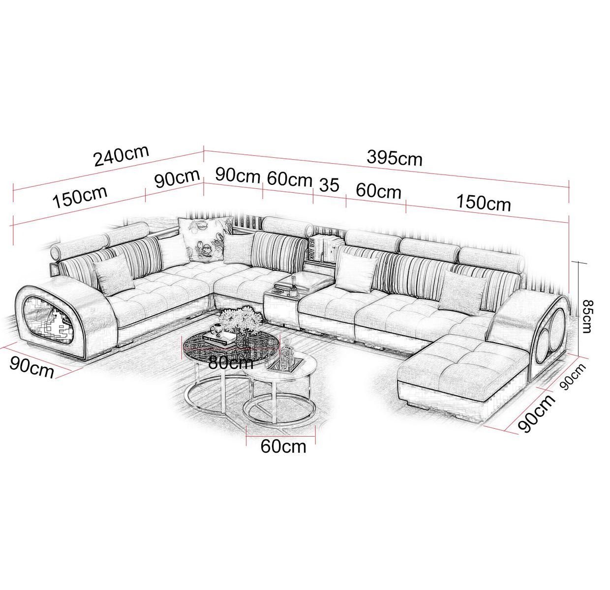 Erleben Sie höchsten Komfort und modernes Design mit unserem Ledersofa U Form Eckgarnitur mit USB-Anschlüssen. Das Designerstück besticht durch seine großzügigen Maße von ca. 240 x 395 x 180 cm oder 180 x 395 x 240 cm und einer angenehmen Sitzhöhe von ca. 42 cm. Dank des Premium Lederfaserstoffs (70% Leder / 30% Polyester) erleben Sie erstklassige Qualität und Langlebigkeit. Das Ledersofa ist in einer Vielzahl von Farben erhältlich, darunter Zyan, Bordeaux, Schokolade, Schwarz und viele mehr. Passen Sie Ihr Sofa ganz nach Ihren Wünschen an! Optional bieten wir auch Echtleder oder Textilstoffe sowie verschiedene Tuning-Optionen wie eine elektrische Relax-Fußstütze oder ein Soundsystem über Bluetooth an. Das Innengestell aus echtem Holz und das hochwertige Rindsleder aus Italien machen dieses Ledersofa zu einem einzigartigen Möbelstück in Ihrem Wohnzimmer. Entspannen Sie in Stil und Luxus auf unserer U Form Eckcouch mit praktischen USB-Anschlüssen. Gönnen Sie sich und Ihrer Einrichtung etwas Besonderes!