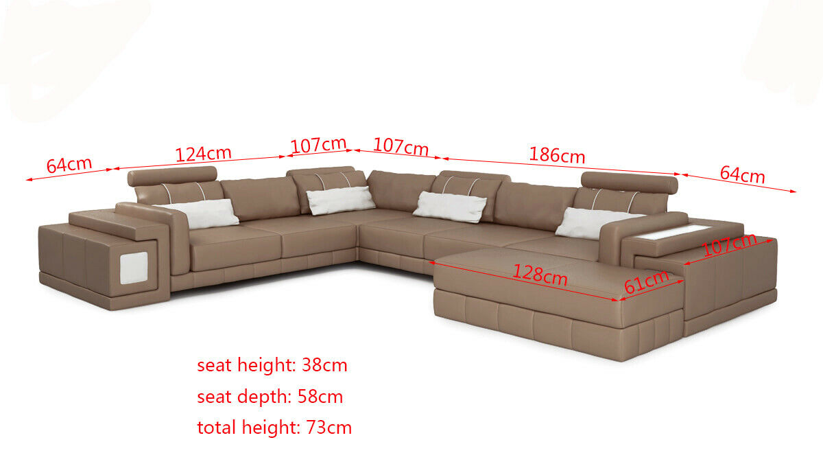 Entspannen Sie in Stil und Komfort mit unserem modernen Ledersofa in U-Form! Diese elegante Wohnlandschaft bietet nicht nur eine moderne Designsprache, sondern auch erstklassige Materialien für Ihre Wohnräume. Maße: - Ecksofa L-Form: ca. 295 x 357 cm oder 357 x 295 cm - Höhe: ca. 73 cm - Tiefe: ca. 107 cm - Sitztiefe: ca. 58 cm - Sitzhöhe: ca. 38 cm Material: Wählen Sie aus hochwertigem Premium Lederfaserstoff (70% Leder / 30% Polyester) in Ihrer Lieblingsfarbe. Oder entscheiden Sie sich optional für Echtleder oder Textilstoff gegen Aufpreis. Die Möbel von XL Möbel sind in verschiedenen Farben erhältlich, darunter Zyan, Burgunderrot, Schwarz, Weiß und viele mehr. Lassen Sie sich von der Vielfalt inspirieren und gestalten Sie Ihr Wohnzimmer nach Ihren Wünschen! Erleben Sie Luxus und Qualität mit dem Ledersofa U-Form Couch Wohnlandschaft Ecksofa Garnitur. Bestellen Sie jetzt und machen Sie Ihr Zuhause zu einer stilvollen Wohlfühloase!