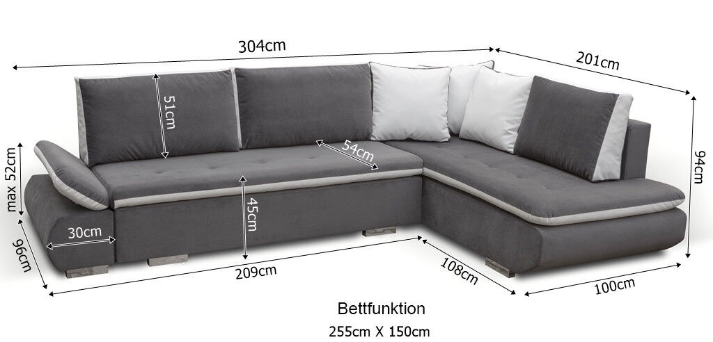 Entspannen Sie stilvoll und komfortabel mit unserem brandneuen Designer-Schlafsofa mit Bettfunktion und Bettkasten! Dieses Ecksofa bietet nicht nur eine gemütliche Liegefläche von ca. 255 x 150 cm, sondern auch extra Stauraum für Ihre Utensilien. Sie haben die Wahl aus einer Vielzahl von Farben, darunter Zyan, Amethyst, Rubinrot, Schokolade, Anthrazit und vielen mehr! Darüber hinaus können Sie das Material nach Ihren Wünschen auswählen, sei es Stoff oder Premium Kunstleder in verschiedenen Gruppen. Das Ecksofa misst ca. 304 x 201 x 94 cm und verfügt über ein stabiles Holzgestell mit Federkern für zusätzlichen Komfort. Gegen einen Aufpreis ist sogar eine Unterboden-LED-Beleuchtung erhältlich, um eine angenehme Atmosphäre zu schaffen. Bestellen Sie jetzt Ihr neues Sofa und verwandeln Sie Ihr Wohnzimmer in eine gemütliche Wohlfühloase!