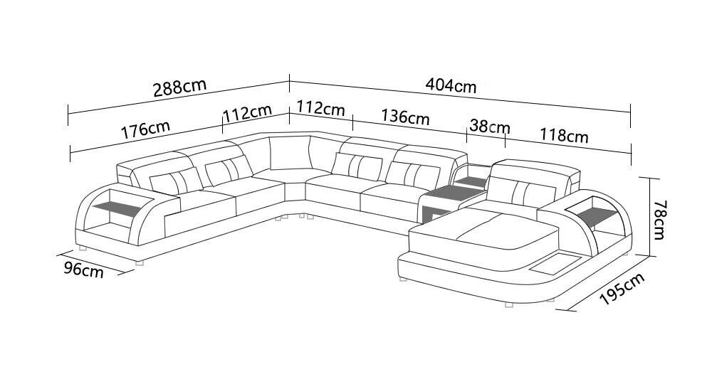 Entspannen Sie in Stil und Komfort mit unserer U-Form Sofa Couch Polster Garnitur Ecksofa Wohnlandschaft Design Leder! Hergestellt aus hochwertigem Premium Lederfaserstoff (70% Leder / 30% Polyester) bietet dieses Ecksofa nicht nur ein elegantes Design, sondern auch Langlebigkeit und Bequemlichkeit. Mit Maßen von ca. 288 x 404 x 195 cm oder 195 x 404 x 288 cm passt dieses Ecksofa perfekt in Ihr Wohnzimmer und lädt zum Verweilen ein. Die Sitzhöhe von ca. 44 cm und die Sitztiefe von ca. 60 cm sorgen für maximalen Komfort. Wählen Sie aus einer Vielzahl von Farben wie Zyan, Amethyst, Flieder, Magenta, Schwarz und vielen mehr, um das Ecksofa an Ihren Einrichtungsstil anzupassen. Optional können Sie auch zwischen verschiedenen Materialien wie Premium Echtleder, Textilstoff oder Vollleder wählen. Das Innengestell aus echtem Holz sorgt zudem für Stabilität und Langlebigkeit. Gönnen Sie sich das Luxuserlebnis, das Sie verdienen, und bestellen Sie noch heute Ihre U-Form Sofa Couch Polster Garnitur Ecksofa Wohnlandschaft Design Leder!