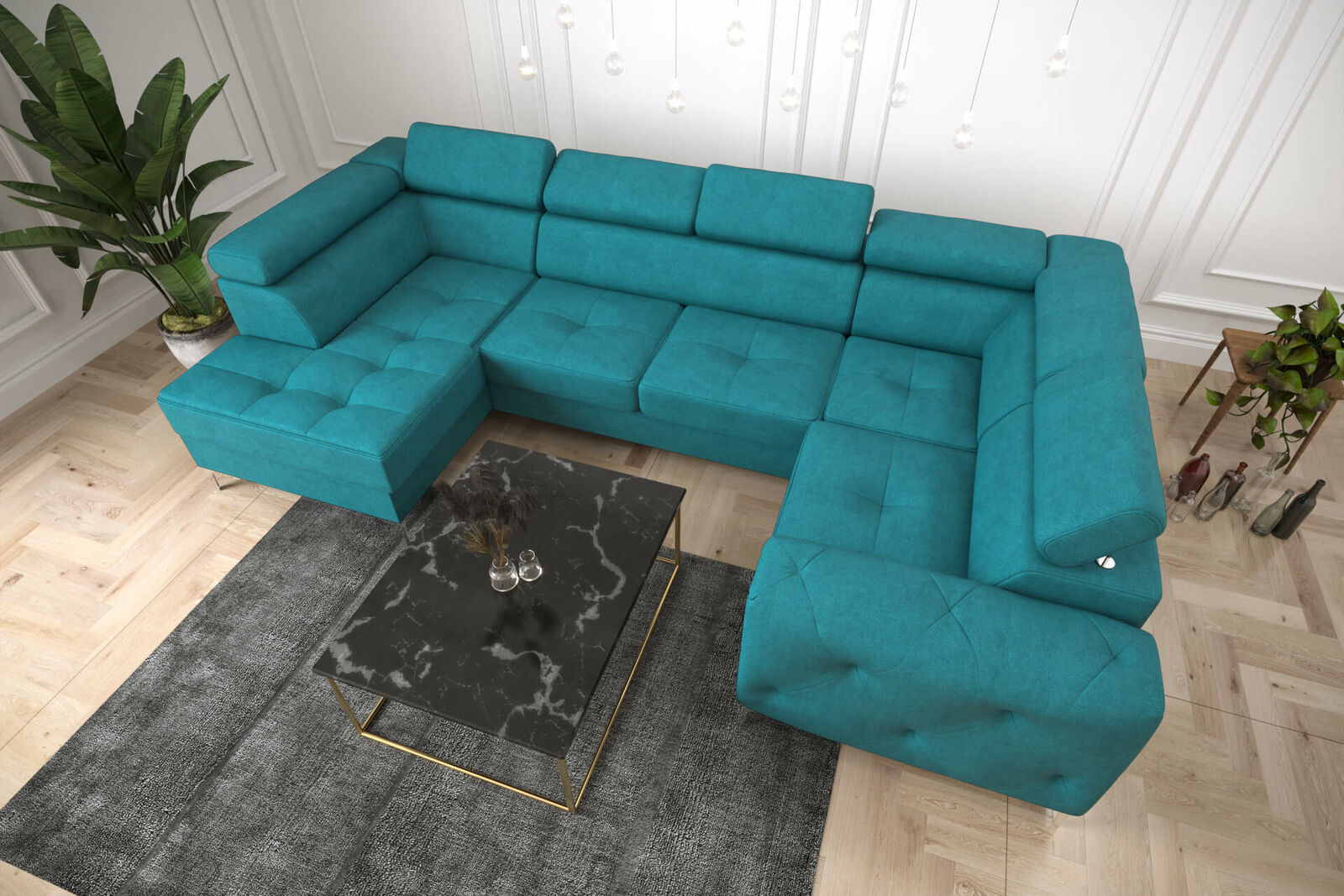 Entspannen Sie in Stil und Komfort mit unserer wunderschönen Wohnlandschaft Sofa Couch Polster Ecke! Die edle Ecksofa in U-Form ist perfekt für gemütliche Abende und geselliges Beisammensein. Mit XL Möbel haben Sie die Möglichkeit, aus einer Vielzahl von Farben wie Zyan, Fuchsia, Weinrot, Schwarz und vielen mehr zu wählen. Passen Sie Ihr neues Lieblingssofa ganz nach Ihren Wünschen an! Die Maße von ca. 350 x 185/170 x 102 cm bieten genügend Platz zum Entspannen. Die Sitzhöhe von ca. 47 cm und die Sitztiefe von ca. 60 cm sorgen für hohen Sitzkomfort. Wählen Sie das Material nach Ihrem Geschmack: Entscheiden Sie sich zwischen Stoff, Premium Kunstleder oder einer Kombination aus beidem. Zusätzlich können Sie einen Bettkasten hinzufügen, um zusätzlichen Stauraum zu schaffen. Das Innengestell aus echtem Holz mit FEDERKERN sorgt für Stabilität und Langlebigkeit. Optional können Sie die Wohnlandschaft mit Unterboden LED Beleuchtung ausstatten, um eine angenehme Atmosphäre zu schaffen. Lassen Sie sich von unserem hochwertigen Ecksofa in U-Form begeistern und gönnen Sie sich ein Stück Luxus für Ihr Zuhause!