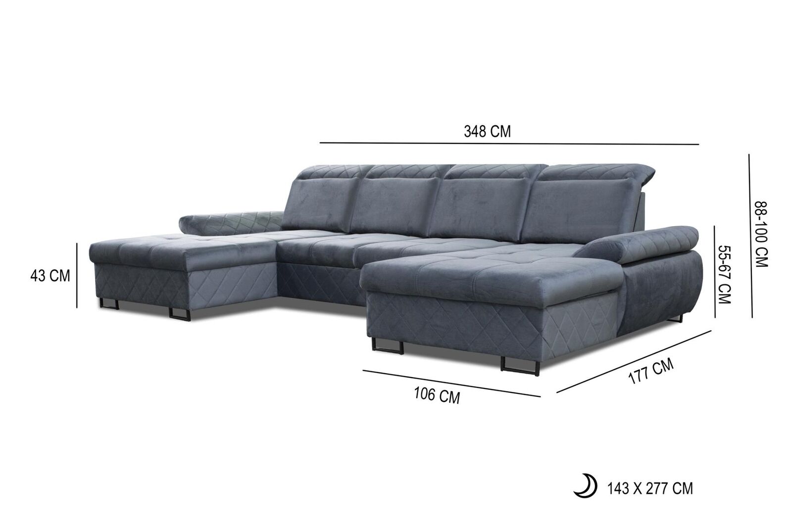 Entdecken Sie die luxuriöse Wohnlandschaft Sofa Couch Polster Sofa Ecke in angesagter U-Form - jetzt neu und exklusiv vom Designer! Mit XL Möbel können Sie Ihr Zuhause mit diesem weichen Ecksofa in verschiedenen Farben wie Zyan, Magenta, Bronze oder Schwarz individualisieren. Die Maße der Wohnlandschaft betragen 177 cm x 348 cm x 177 cm auf der linken Seite und die Höhe ca. 88/100 cm. Entspannen Sie auf einer komfortablen Sitzfläche mit einer Sitzhöhe von 43 cm und einer Sitztiefe von ca. 60 cm. Der Schlafbereich bietet großzügige 143 x 277 cm für erholsame Nächte. Das Ecksofa verfügt über ein stabiles Innengestell aus echtem Holz und wird in der von Ihnen gewünschten Farbe geliefert. Verleihen Sie Ihrem Wohnzimmer mit dieser exklusiven U-Form Wohnlandschaft das gewisse Etwas!
