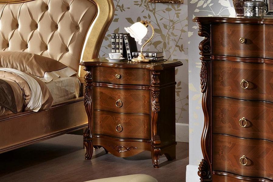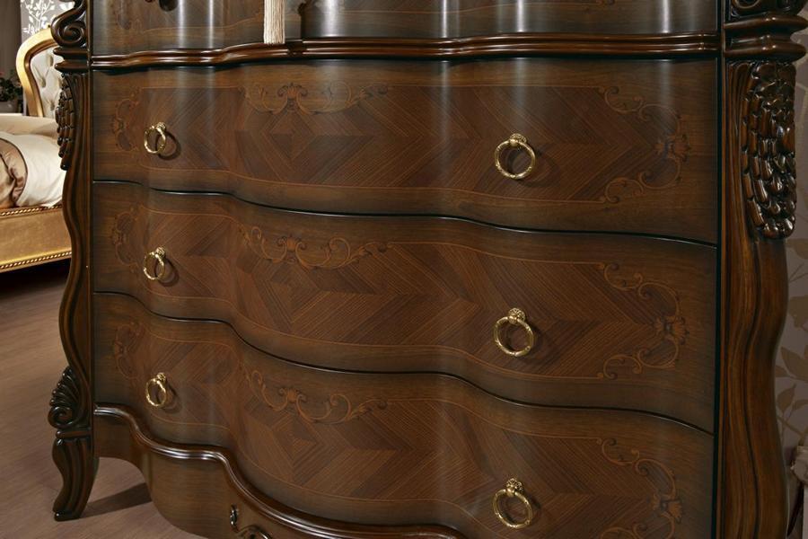 Bringen Sie mit unserem eleganten 5-teiligen Schlafzimmermöbel-Set ultimativen Luxus in Ihr Zuhause! Das Bett wurde aufwendig gefertigt und misst ca. 207 x 175 x 160 cm mit einer Liegefläche von 160x200 cm. Zwei stilvolle Nachttische mit den Maßen ca. 67 x 44 x 75 cm, eine geräumige Kommode (ca. 127 x 56 x 118 cm) und ein stattlicher Kleiderschrank (ca. 288 x 70 x 260 cm) komplettieren das Set. Hergestellt aus hochwertigem Holz in einer wunderschönen Farbe wie abgebildet. Verleihen Sie Ihrem Schlafzimmer mit unserem Möbel-Set eine luxuriöse Note.