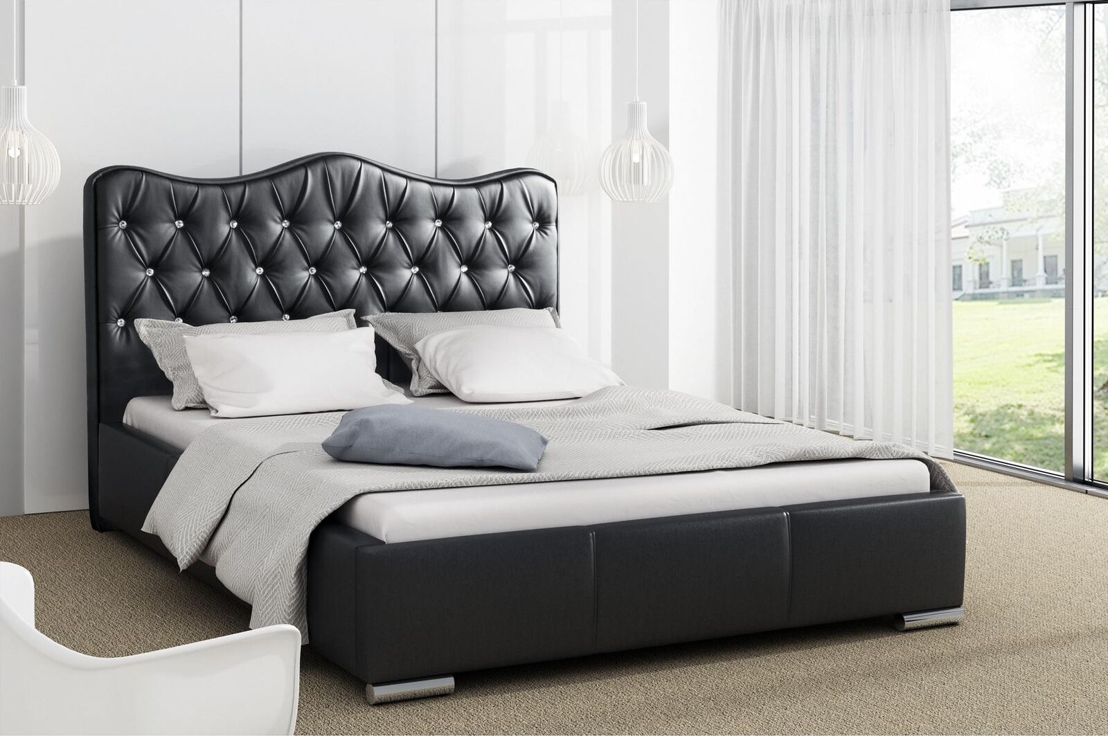 Bringen Sie mit dem Bettrahmen Betten Ehebett Modern in Schwarz das ultimative hochwertige Schlafzimmermöbel in Ihr Zuhause. Dieses Kunstleder Polsterbett in Doppelbettgröße besticht durch seine aufwendige Verarbeitung und das moderne Design. Die Liegefläche von ca. 180 x 200 cm bietet ausreichend Platz zum Entspannen. Der Bettrahmen ist ca. 198 cm breit, 218 cm lang und 100 cm hoch. Die gesteppte Kopfstütze ist mit 3 cm Schaumstoff gepolstert und mit Kristallen verziert. Standardmäßig ist das Bett mit Polsterknöpfen versehen und verfügt über einen Metallrahmen mit 34 belastbaren Lamellen sowie einen Gaslift mit 1000N. Wählen Sie aus verschiedenen optionalen Liegeflächen-Maßen und freier Farbwahl. Das Material ist wahlweise Stoff oder Premium Kunstleder der Gruppe I ohne Aufpreis oder der Gruppe II gegen Aufpreis. Der Lieferumfang umfasst das Bett, und optional können Sie einen Bettkasten oder eine Matratze dazubestellen. Holen Sie sich jetzt Ihr modernes, bequemes und stilvolles Ehebett nach Hause!