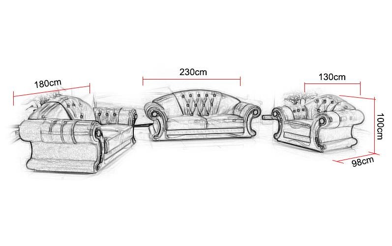 Entdecken Sie das Chesterfield Sofa - eine klassische Couchgarnitur in 3 Teilen, die jeden Raum in ein elegantes Ambiente verwandelt. Mit Maßen von ca. 230 x 98 x 100 cm (3-Sitzer), ca. 180 x 98 x 100 cm (2-Sitzer) und ca. 130 x 98 x 100 cm (1-Sitzer) bietet dieses Sofa nicht nur Komfort, sondern auch Stil. Das Beste daran? Sie können die Farbe des Sofas frei wählen! Zudem besteht die Möglichkeit, aus verschiedenen Materialien zu wählen, darunter Premium Lederfaserstoff (70% Leder / 30% Polyester), Premium Echtleder, Premium Textilstoff oder Premium Vollleder. Erfüllen Sie sich Ihren Wohntraum und gestalten Sie Ihre Big Couch ganz nach Ihren Wünschen. Mit einem Innengestell aus echtem Holz und hochwertigen Bezügen ist dieses Sofa nicht nur optisch ansprechend, sondern auch langlebig. Holen Sie sich noch heute Ihr Chesterfield Sofa und machen Sie Ihr Zuhause zu einem Ort der Gemütlichkeit und Eleganz!