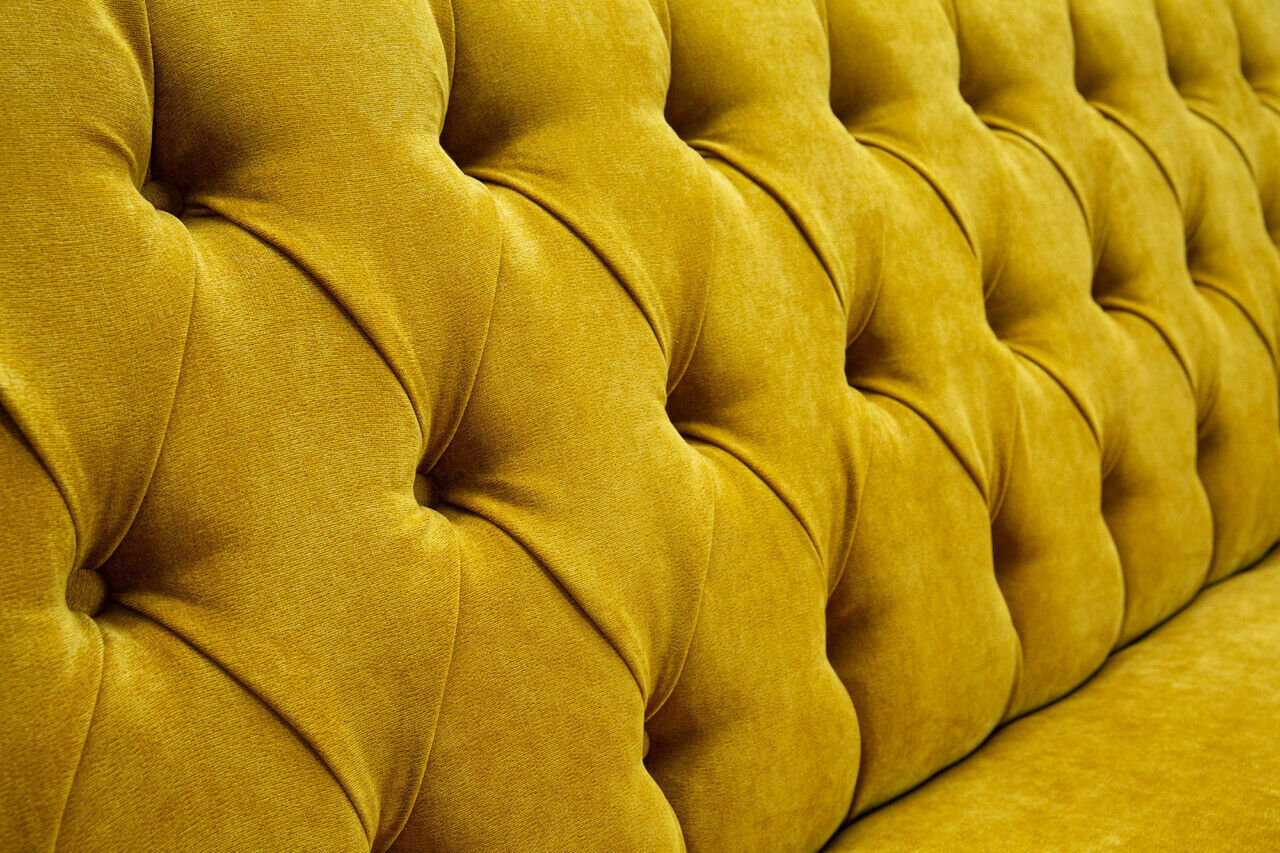 Erwerben Sie das elegante klassische Chesterfield Sofa in Gelb für Ihr Zuhause! Dieses hochwertige 4-Sitzer Sofa besteht aus echtem italienischem Rindsleder und verleiht Ihrem Wohnzimmer einen Hauch von Luxus. Mit einer unendlichen Auswahl an Farben zur Auswahl können Sie das Sofa an Ihren persönlichen Stil anpassen. Die Maße des Sofas betragen ca. 250 cm in der Länge, 78 cm in der Höhe und 100 cm in der Tiefe. Die Sitzhöhe beträgt ca. 42 cm und die Sitztiefe liegt bei ca. 64 cm. Optional sind auch andere Größen wie 5-Sitzer, 3-Sitzer, 2-Sitzer und 1-Sitzer erhältlich. Das Sofa ist mit verschiedenen Materialien erhältlich, darunter Premium Kunstleder/Stoff, Premium Echtleder, Premium Samt Stoff und Magic Home Fleckenabweisender Stoff. Das Premium Echtleder stammt aus Italien und kann sogar mit echten Swarovski Kristallsteinen verziert werden. Das Innengestell des Sofas besteht aus echtem Holz und bietet eine robuste und langlebige Konstruktion. Die komfortable Federkernpolsterung sorgt für ein bequemes Sitzerlebnis. Bringen Sie mit diesem Chesterfield Sofa Eleganz und Stil in Ihr Wohnzimmer. Bestellen Sie jetzt und machen Sie dieses exklusive Möbelstück zu einem Highlight in Ihrem Zuhause!