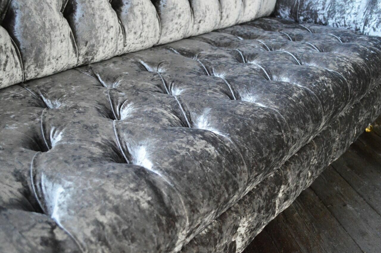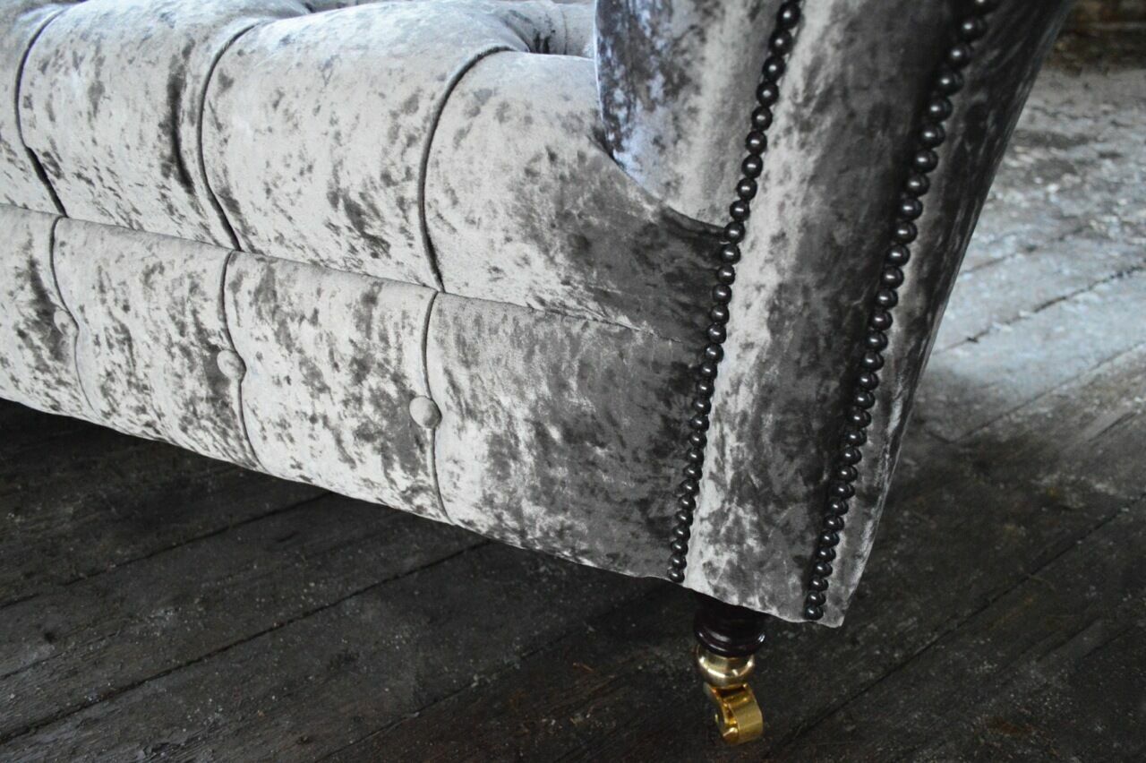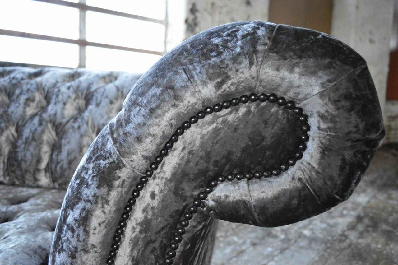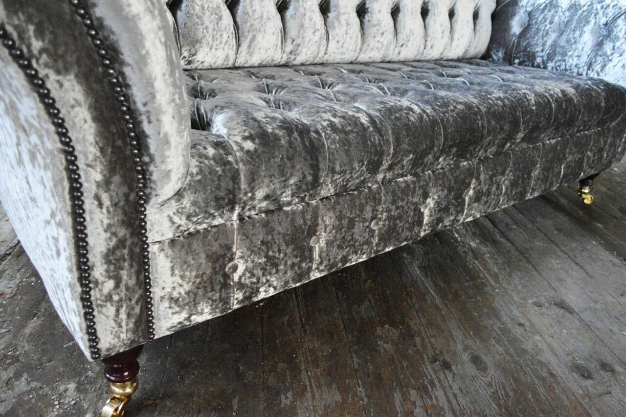 Erwerben Sie jetzt dieses elegante Dreisitzer Silber Couch Polster Design Sofa und verleihen Sie Ihrem Wohnzimmer einen Hauch von Luxus und Komfort! Das Sofa ist in verschiedenen Größen erhältlich, und Sie können aus einer Vielzahl von Farben wie Taubengrau, Zementgrau, Lavendelgrau und vielen mehr wählen. Hergestellt aus hochwertigem Textilmaterial, können Sie auch zwischen verschiedenen Materialoptionen wie Premium Kunstleder, Premium Echtleder oder Premium Samt Stoff wählen. Das Sofa hat eine komfortable Sitzhöhe von ca. 42 cm und eine Sitztiefe von ca. 64 cm, perfekt zum Entspannen nach einem langen Tag. Der Innengestell aus echtem Holz und der Federkern sorgen für Stabilität und Langlebigkeit. Optional sind auch Upgrades wie Magic Home (Fleckenabweisender Stoff) oder echte Swarovski Kristallsteine für eine luxuriöse Note erhältlich. Verpassen Sie nicht die Chance, Ihr Wohnzimmer mit diesem stilvollen Chesterfield Sofa zu verschönern. Wählen Sie Ihre Wunschfarbe und Größe und bestellen Sie noch heute!