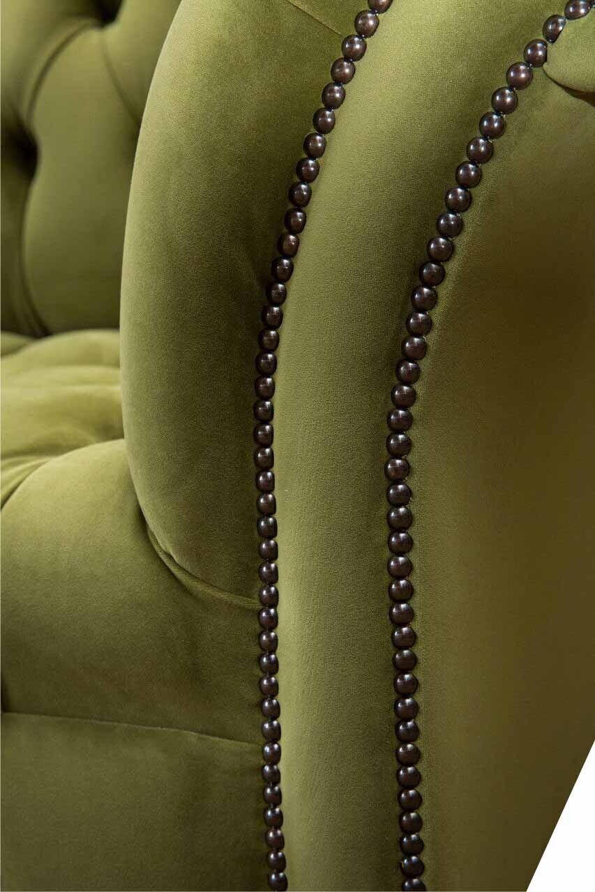 Erwerben Sie dieses elegante 2-Sitzer-Sofa aus Stoff in einem modernen Chesterfield-Design. Das gemütliche Sofa ist in verschiedenen Größen erhältlich und nun auch in einem frischen Grünton verfügbar. Die Maße des Sofas betragen ca. 185 x 80 x 90 cm (L x B x H), mit einer komfortablen Sitzhöhe von ca. 42 cm und einer Sitztiefe von ca. 52 cm. Wählen Sie aus einer Vielzahl von Farben für das Textilmaterial und die Holzdetails. Für zusätzliche Optionen stehen verschiedene Materialgruppen zur Verfügung, darunter Premium-Kunstleder, Premium-Echtleder, Premium-Samtstoff und Magic Home (fleckenabweisender Stoff). Passen Sie das Sofa an Ihre Bedürfnisse an, indem Sie zwischen 5-Sitzer, 4-Sitzer, 3-Sitzer, 2-Sitzer oder 1-Sitzer wählen. Maßanfertigungen sind auf Anfrage ebenfalls möglich. Genießen Sie luxuriösen Komfort mit dem Federkern und dem Innengestell aus echtem Holz. Entscheiden Sie sich für glamouröse Akzente mit Kristallsteinen oder Swarovski Kristallsteinen gegen einen Aufpreis. Erleben Sie zeitlose Eleganz und Qualität mit diesem exquisiten Sofa - perfekt für Ihr Wohnzimmer!