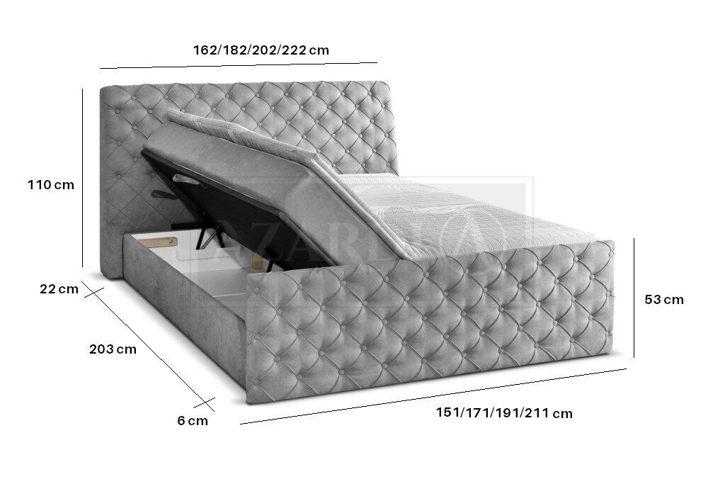Holen Sie sich das ultimative Bett in Ihr Schlafzimmer mit dem grauen Doppelbett Chesterfield Hotel! Dieses Designer-Bett wird sehr aufwändig gefertigt und ist in verschiedenen Farben erhältlich. Sie haben die freie Wahl der Maße, der Farbe und des Materials, sei es Premium Kunstleder oder Stoff der Gruppen 1 bis 5. Optional im Shop können Sie auch eine Matratze, einen Lattenrost und ein Hebesystem mit Bettkasten dazu erwerben. Das Bett besteht aus einem Innengestell aus echtem Holz und bietet Ihnen eine Matratzenaufliegefläche von ca. 180 x 200 cm. Mit einer Länge von ca. 203 cm und einer Höhe von ca. 110 cm passt dieses Chesterfield Bett perfekt in Ihr Schlafzimmer. Entscheiden Sie sich sogar für die luxuriöse Echtleder-Option aus Italien mit Kristallstein-Verzierungen für einen glamourösen Look. Machen Sie Ihr Schlafzimmer zu einem echten Designer-Schlafgemach mit dem grauen Doppelbett Chesterfield Hotel!
