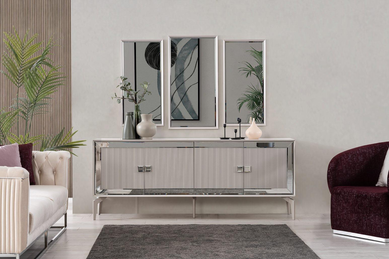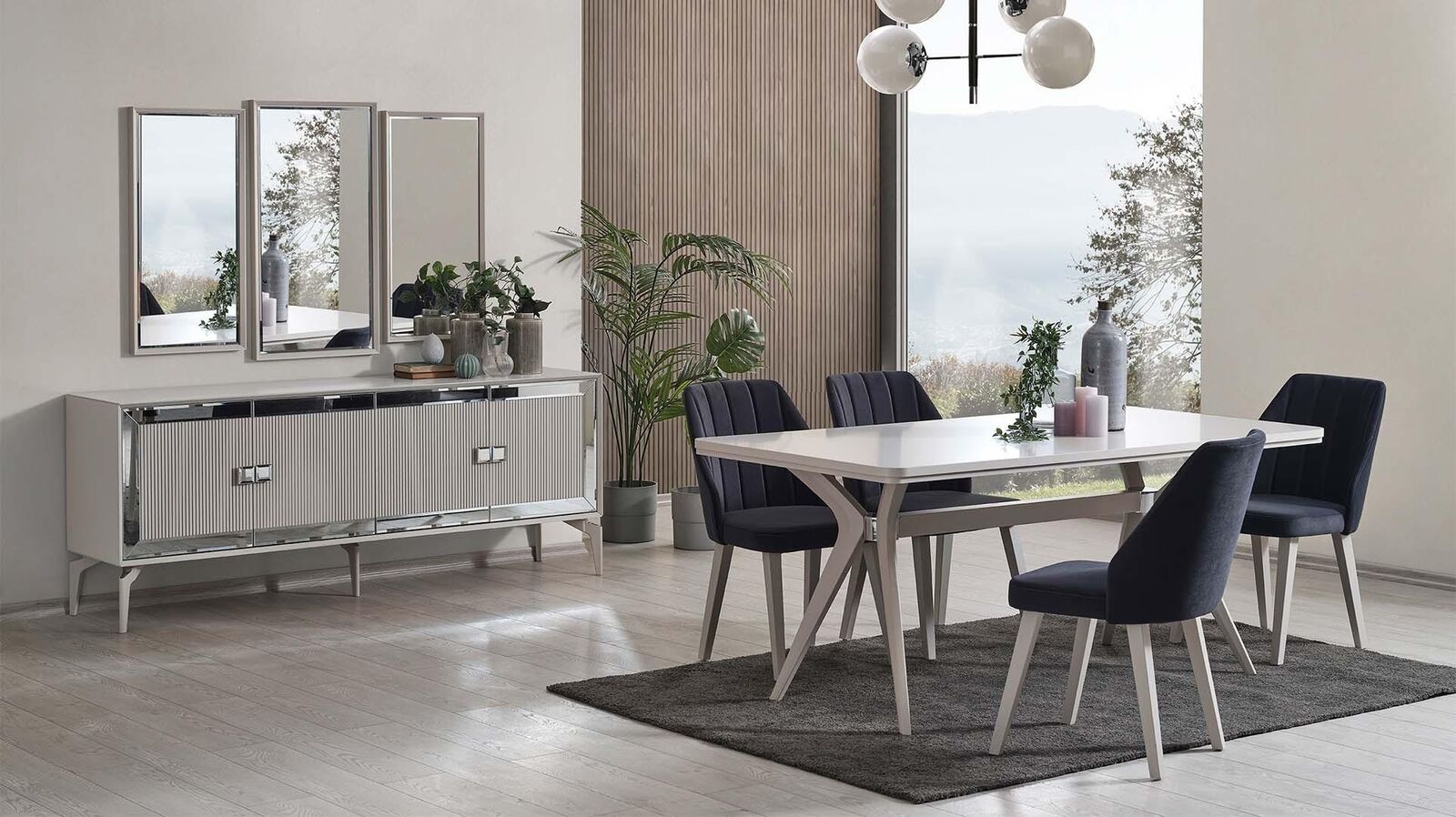 Erhöhen Sie den Glamour in Ihrem Esszimmer mit unserer luxuriösen 9-teiligen Esszimmergarnitur "Esszimmer Luxus Essgruppe Garnitur Esstisch Set" in Grau! Dieses atemberaubende Set besteht aus einem eleganten Esstisch, bequemen Stühlen, einem geräumigen Sideboard und einem stilvollen Spiegel. Hergestellt aus hochwertigem Holz und Stoff, überzeugt dieses Set nicht nur mit seinem Design, sondern auch mit seiner Qualität. Die Maße sind perfekt aufeinander abgestimmt und die Farbe Grau verleiht Ihrem Esszimmer eine edle Note. Lassen Sie sich von B2B Moebel verwöhnen und genießen Sie Luxus und Komfort in Ihrem Zuhause!