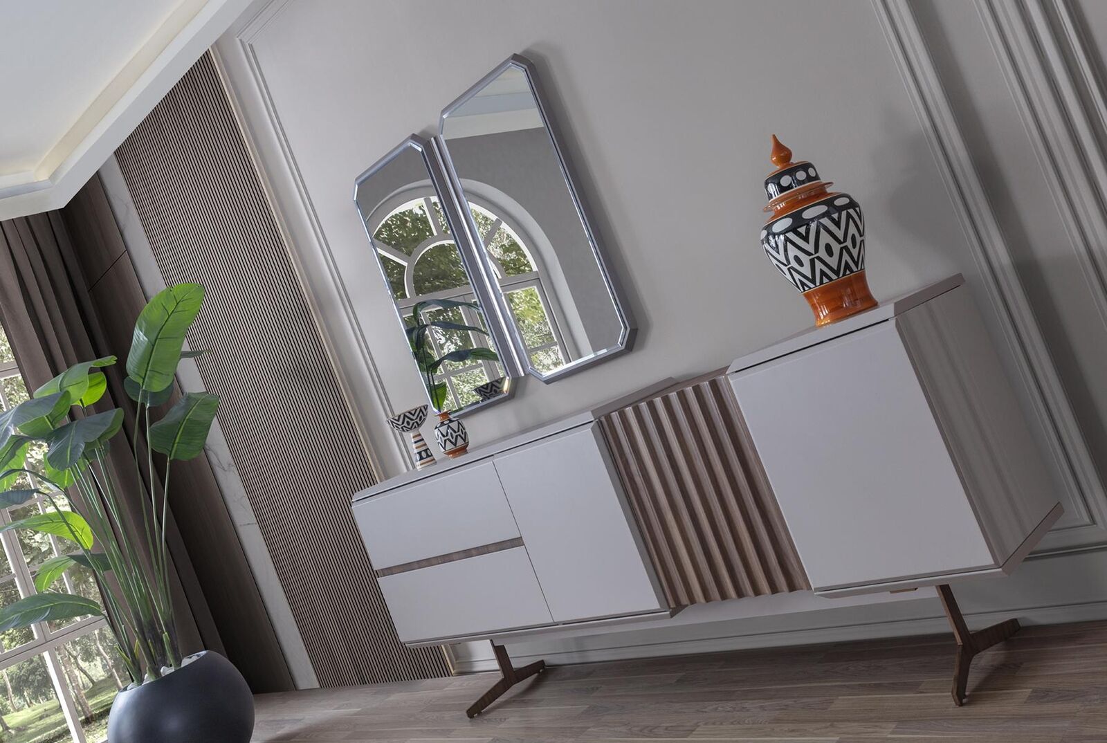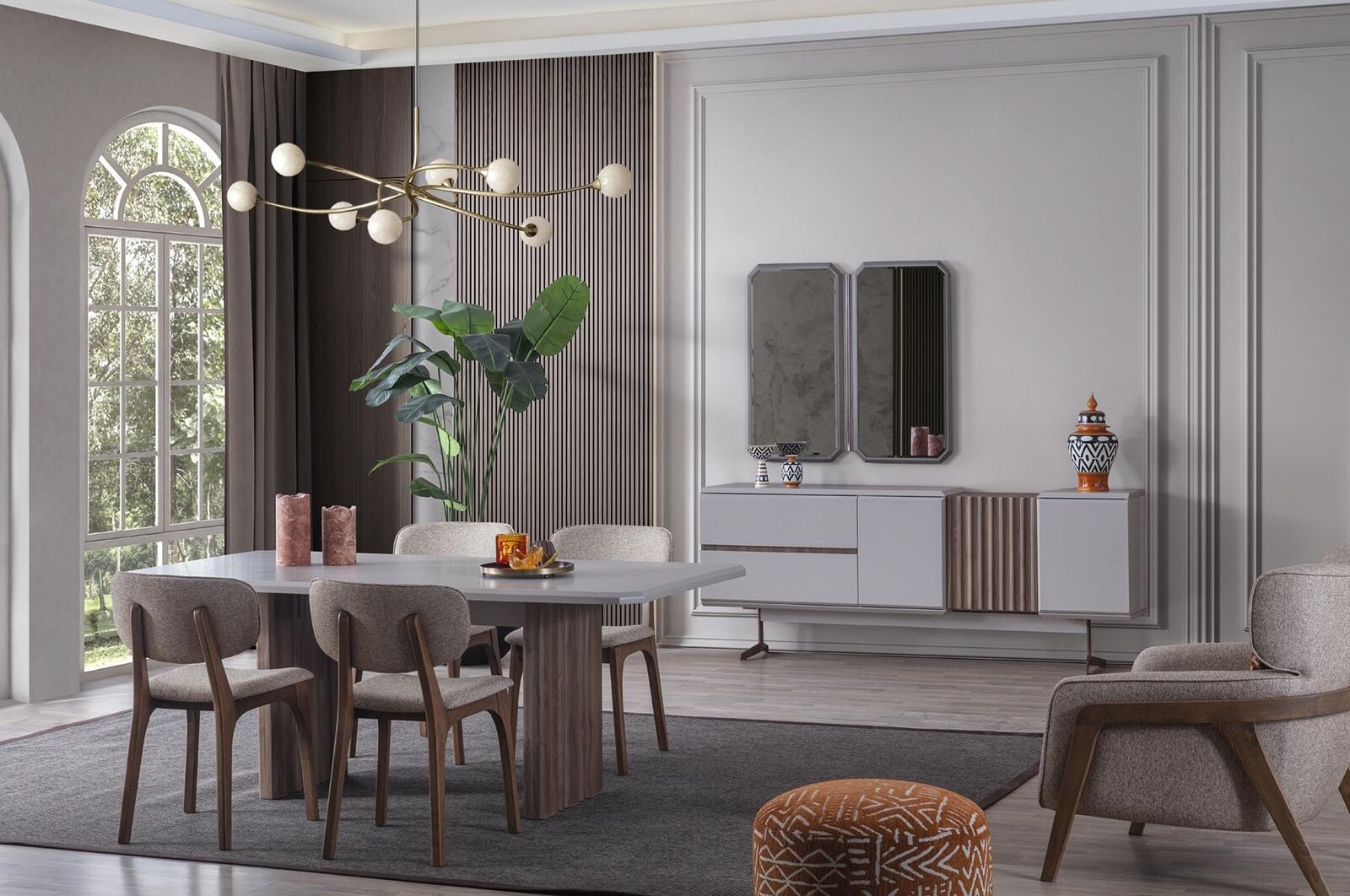 Erwecken Sie Ihr Esszimmer zum Leben mit diesem eleganten Esszimmer-Set! Das 8-teilige Esszimmer-Set besteht aus einem modernen Esstisch, 4 Stühlen, einem Sideboard und 2 Spiegeln, die perfekt aufeinander abgestimmt sind. Der Esstisch misst ca. 200 x 100 x 77,2 cm, während die Stühle jeweils ca. 55 x 50 x 80 cm groß sind. Das Sideboard bietet mit ca. 210 x 42 x 83,5 cm viel Stauraum. Die Farbe ist wie abgebildet, kann aber auf Anfrage angepasst werden. Hergestellt aus hochwertigem Holz, Textil und Glas, ist dieses Esszimmer-Set eine ideale Kombination aus Stil und Funktionalität. Bringen Sie mit diesem Möbel-Set von B2B Moebel neuen Schwung in Ihr Zuhause und genießen Sie gemütliche Mahlzeiten in modernem Ambiente. Bereit für eine Veränderung?