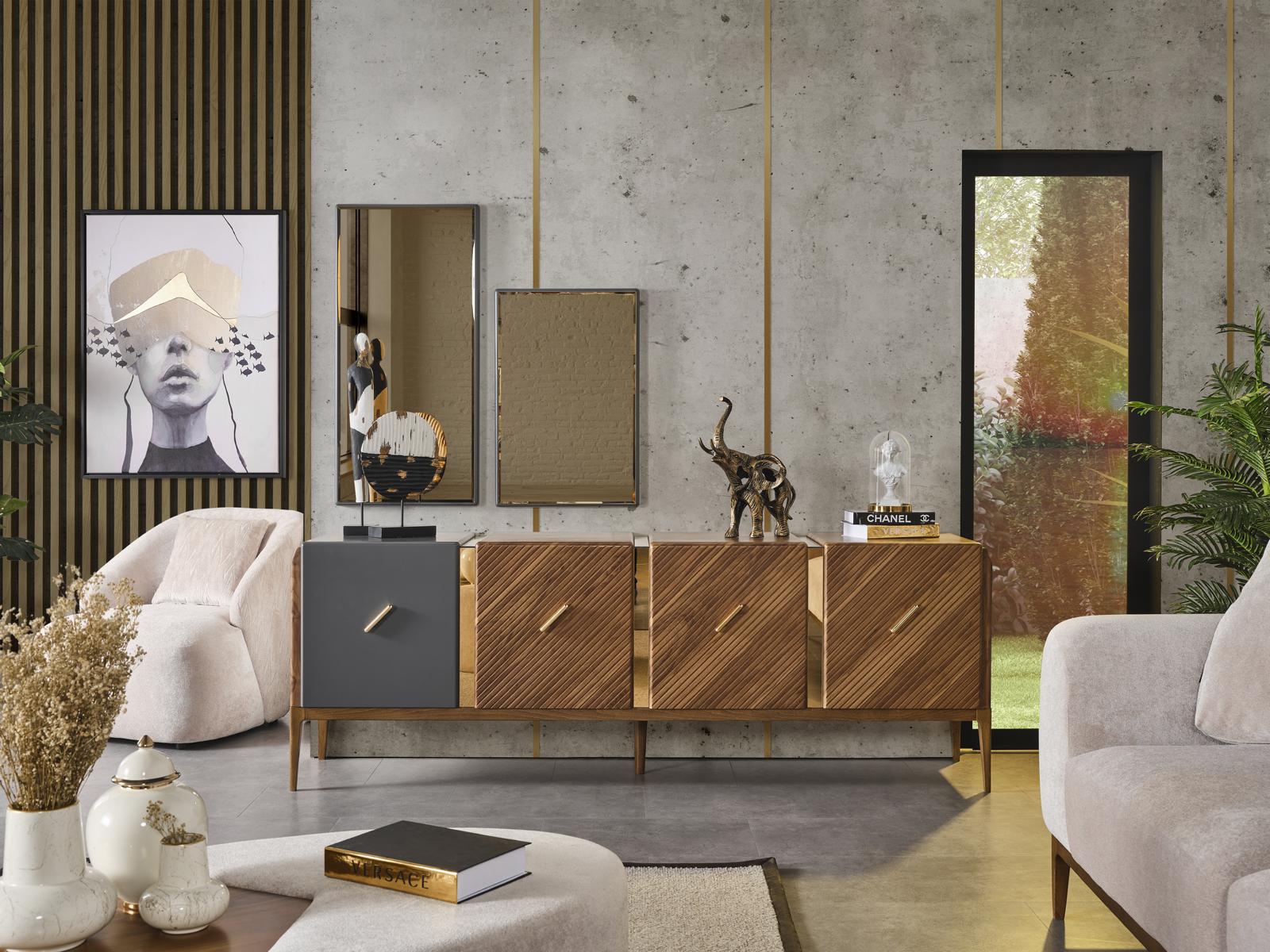 Entdecken Sie unsere luxuriöse Essgruppe für Ihr Esszimmer! Diese 6-teilige Garnitur in Braun besteht aus einem Esstisch, 4 Stühlen und einem Sideboard ohne Spiegel - alles, was Sie für ein stilvolles Esszimmer benötigen. Der ausziehbare Tisch bietet Platz für bis zu 6 Personen und ist in der Länge von 170 auf 210 cm erweiterbar. Die Stühle und das Sideboard bestechen durch hochwertiges Holz und eleganten Stoff. Bringen Sie mit dieser Essgruppe von B2B Moebel Luxus in Ihr Zuhause!