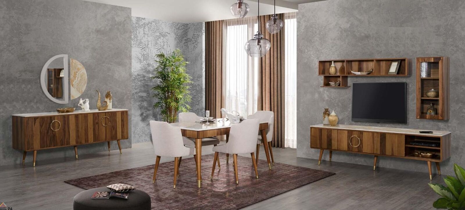 Bringen Sie mit diesem modernen Esszimmer-Set von B2B Moebel frischen Wind in Ihr Zuhause! Die Essgarnitur besteht aus einem Esstisch, 4 Stühlen, einem Sideboard und einem RTV. Der Esstisch misst ca. 160 x 90 x 77 cm, während die Stühle jeweils ca. 60 x 58 x 80 cm groß sind. Das Sideboard hat Maße von ca. 205 x 48 x 80 cm und das RTV ca. 208 x 48 x 62 cm. Aus hochwertigem Holz gefertigt, bietet dieses Set sowohl modernes Design als auch Funktionalität. Die Farbe entspricht dem abgebildeten Stil, perfekt für jeden Essbereich. Bringen Sie Stil und Komfort in Ihr Esszimmer mit diesem Komplettset! Perfekt für moderne, klassische oder skandinavische Einrichtungsstile, ist diese Essgarnitur vielseitig einsetzbar. Schaffen Sie sich Ihr persönliches Esszimmer, das sowohl gemütlich als auch stilvoll ist. Bestellen Sie jetzt und lassen Sie Ihr Esszimmer erstrahlen!