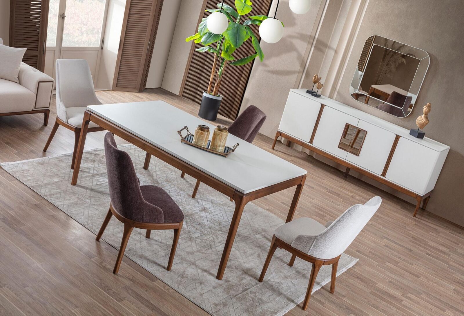 Entdecken Sie unser Luxus Esszimmer Set, bestehend aus einem Esstisch, 4 Stühlen, einer Anrichte und einem Spiegel! Dieses moderne 7-teilige Set ist die perfekte Ergänzung für Ihr Esszimmer. Der Esstisch ist von 181 auf 220 cm ausziehbar, während die Stühle mit den Maßen 48 x 48 x 87 cm für Komfort sorgen. Die Anrichte mit den Maßen 214 x 45 x 88 cm bietet reichlich Stauraum, ergänzt durch den eleganten Spiegel von 90 x 2 x 90 cm. In der Farbe wie abgebildet und aus hochwertigen Materialien wie Holz, Textil und Glas gefertigt, wird dieses Set Ihren Essbereich in einen luxuriösen Raum verwandeln. Holen Sie sich jetzt Ihr neues Esszimmer Set von B2B Moebel!