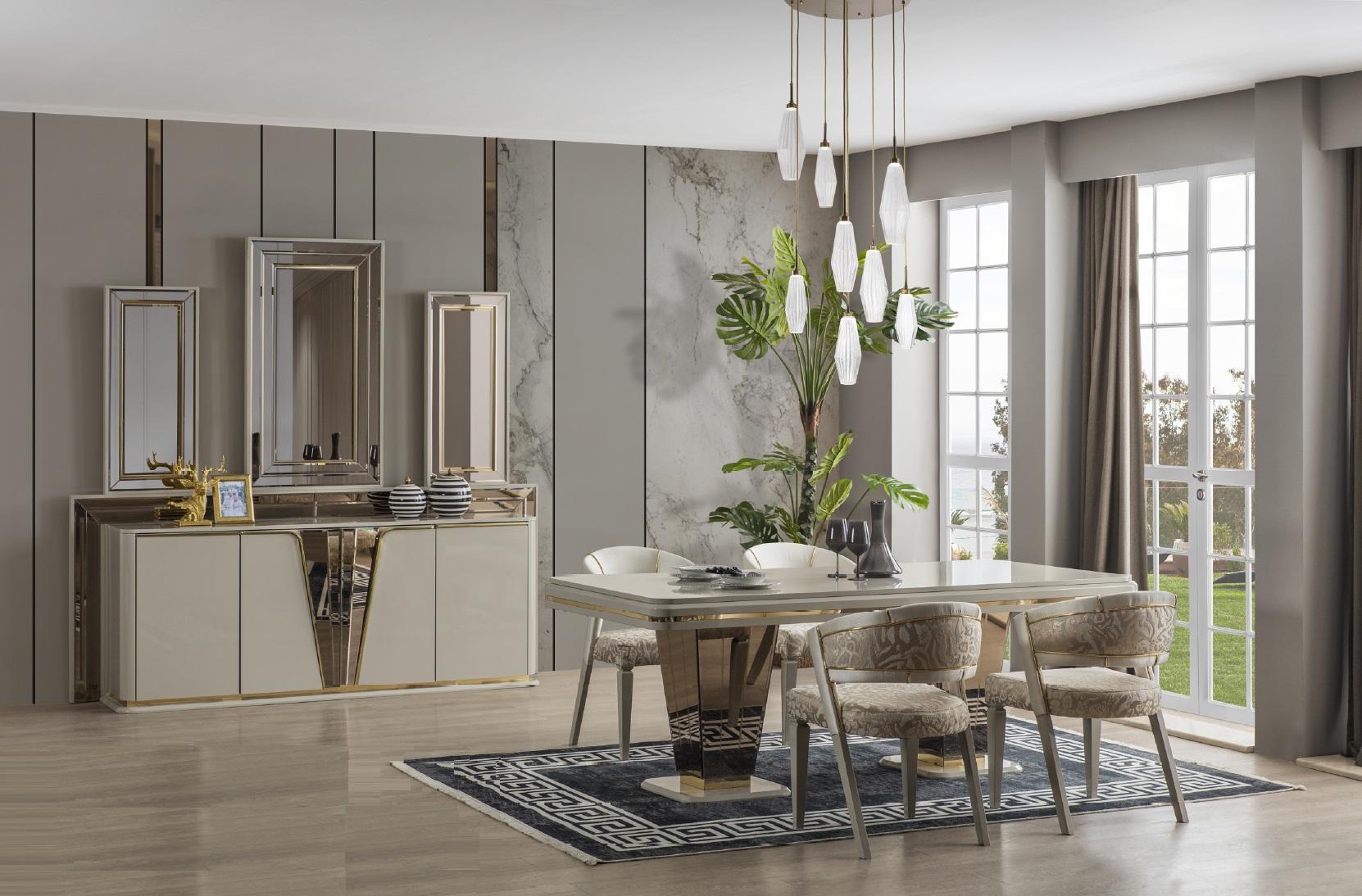 Entdecken Sie die Luxus Essgruppe Esszimmer Esstisch Garnitur Stühle Essecke in Beige! Diese 6-teilige Set von B2B Moebel bietet Eleganz und Komfort für Ihr Esszimmer. Der Esstisch misst ca. 220 x 96 x 78 cm und die 4 Stühle jeweils ca. 50 x 55 x 100 cm. Das Sideboard ohne Spiegel ist ca. 240 x 44 x 98 cm groß. Hergestellt aus hochwertigem Holz und Stoff in der abgebildeten Farbe. Bringen Sie mit dieser modernen Essgruppe Stil in Ihr Zuhause! Ideal für ein gemütliches Beisammensein mit Familie und Freunden. Bestellen Sie jetzt und gestalten Sie Ihr Esszimmer neu!