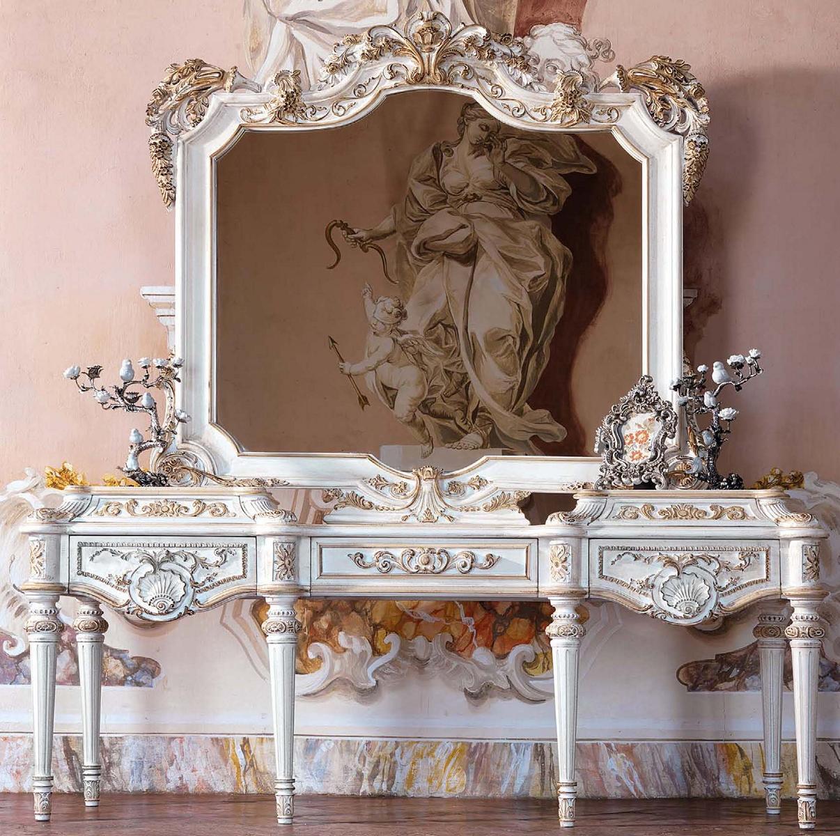 Luxuriöser weißer Konsolentisch und Spiegel mit geschnitztem Rahmen