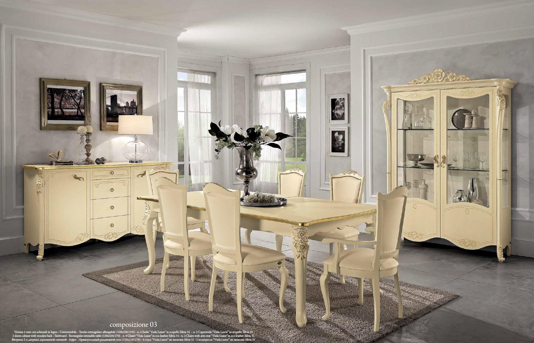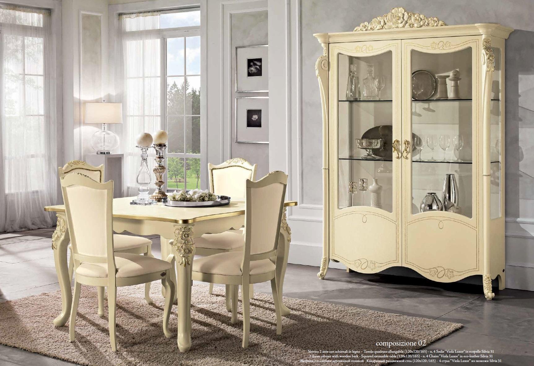 Entdecken Sie unsere stilvolle Esszimmer-Gruppe von Mobilpiu Luxury! Diese elegante 7-teilige Möbelgarnitur aus Italien besteht aus einem beigefarbenen Esstisch, 4 Stühlen, einer Kommode und einer Vitrine. Der Esstisch misst ca. 180(230) x 100 x 79 cm und kann verlängert werden. Die Stühle haben eine angenehme Sitzhöhe von ca. 44 cm und sind ca. 55 x 50 x 104,5 cm groß. Die Kommode misst ca. 186 x 59 x 104 cm und die Vitrine ca. 157 x 51 x 222 cm. Hergestellt aus hochwertigem Holz, verleiht dieses Ensemble Ihrem Esszimmer eine exklusive Note. Bestellen Sie jetzt und profitieren Sie von italienischem Luxus für Ihr Zuhause!