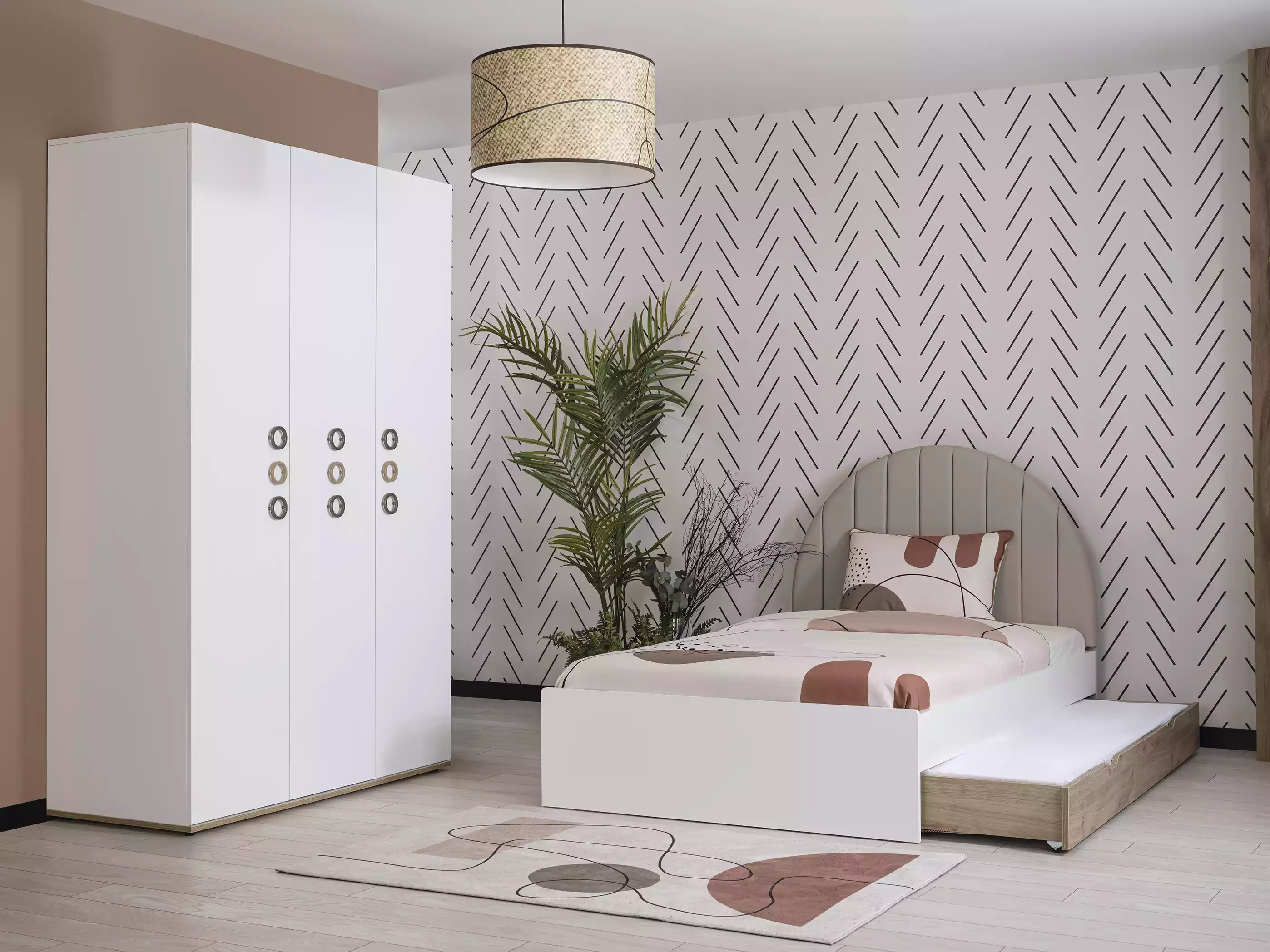 Entdecken Sie das traumhafte 3-teilige Set für das Kinderzimmer: Jugendbett, Nachttisch und Kleiderschrank in zeitlosem Weiß! Hergestellt aus hochwertigem Holz bietet diese Garnitur nicht nur eine stilvolle Optik, sondern auch eine robuste und langlebige Qualität. Perfekt für das Kinderzimmer und Jugendzimmer geeignet. Das Bett hat eine Matratzenaufliegefläche von ca. 100 cm x 200 cm und eine Gesamtgröße von ca. 107 cm x 208 cm x 117 cm. Der Nachttisch misst ca. 46 cm x 45 cm x 38 cm und der Kleiderschrank ca. 135 cm x 60 cm x 212 cm. Ein Muss für Ihr Zuhause!