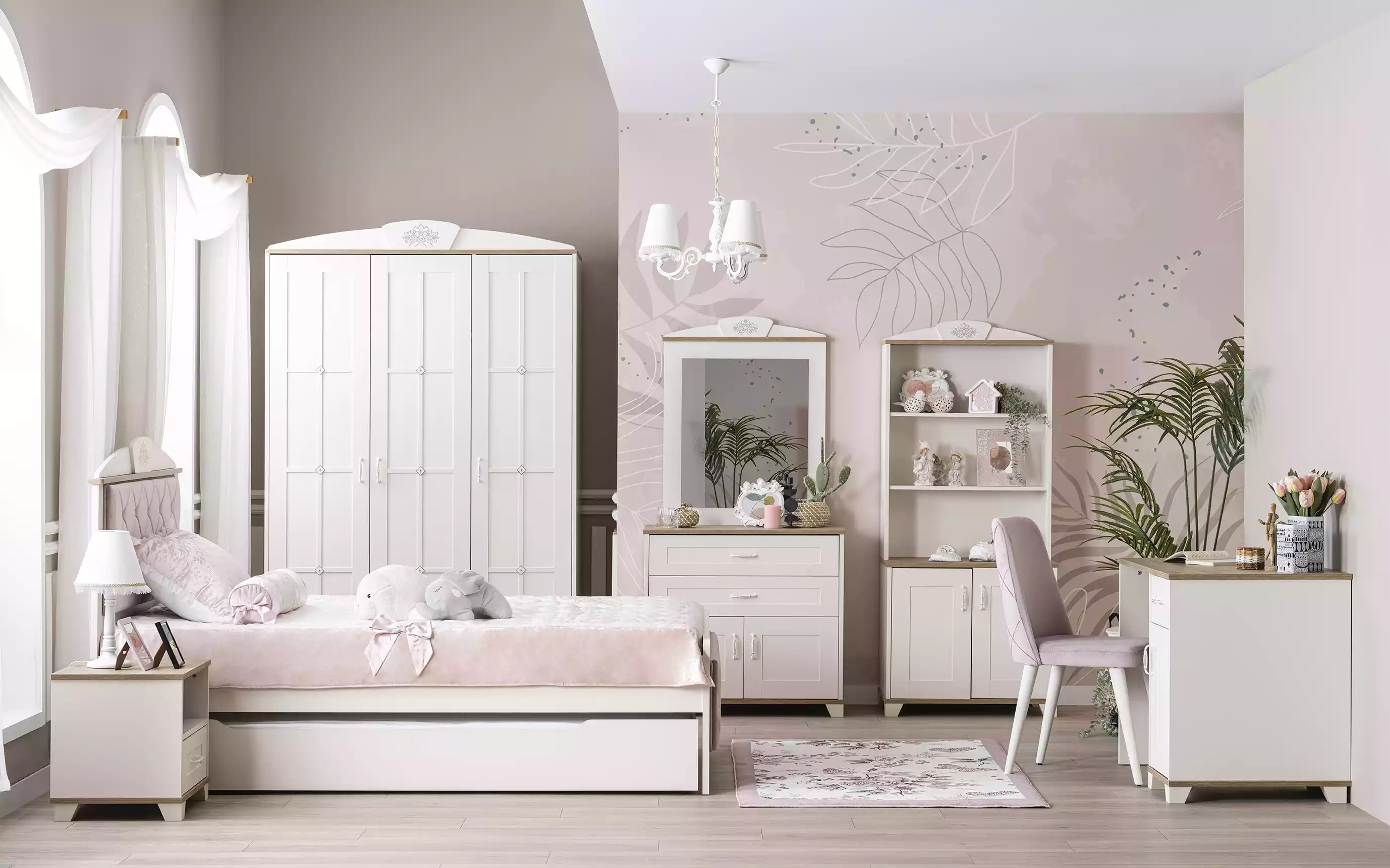Kindermöbel set, Bett, Nachttisch, Kleiderschrank, Kommode, Bücherregal, Schreibtisch, Spiegel