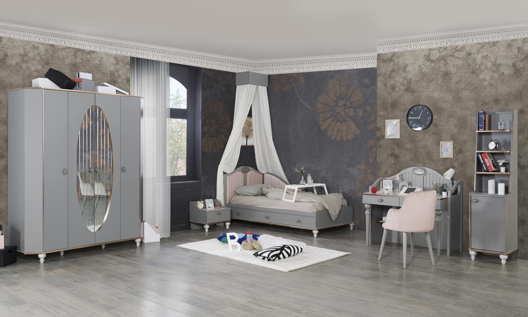 Kindermöbel set, Bett, Nachttisch, Kleiderschrank, Schreibtisch, Bücherregal