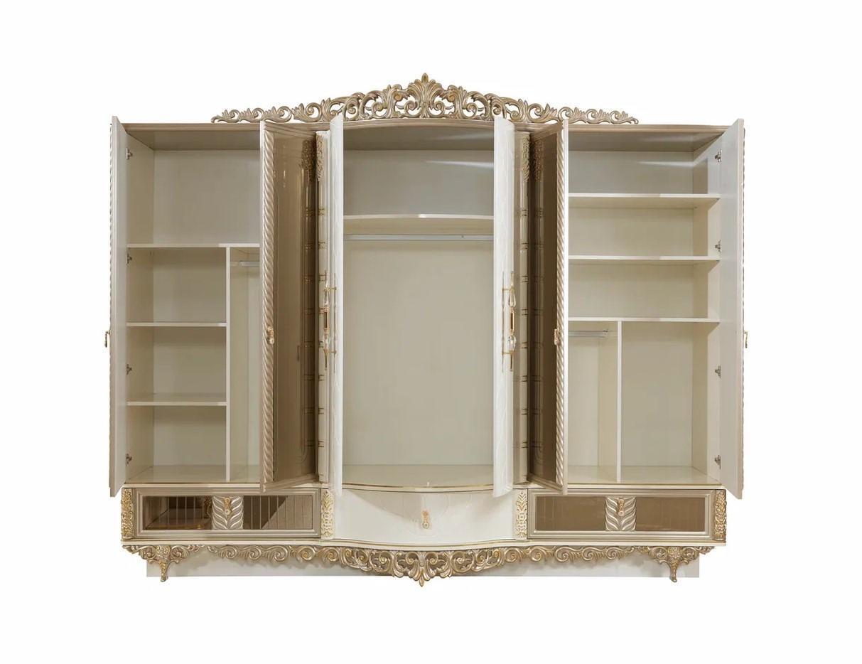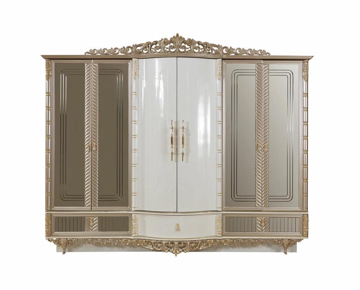 Erwecken Sie mit dem sechstürigen Kleiderschrank für das Schlafzimmer aus Holz von B2B Moebel einen Hauch von Eleganz in Ihrem Zuhause. Dieses klassische Möbelstück besticht durch seine edle Verarbeitung und geschwungenen Formen, die Ihren Raum im Barockstil bereichern. Hergestellt aus Holz und Glas in den Maßen ca. 300 x 75 x 250 cm fügt sich dieser Schrank perfekt in jedes Schlafzimmer ein. Holen Sie sich jetzt dieses zeitlose Stück und verleihen Sie Ihrem Zuhause einen Hauch von Luxus.