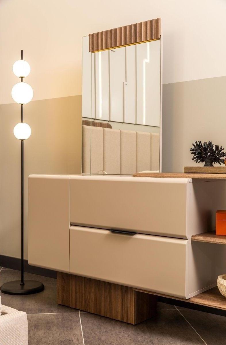 Schlafen Sie stilvoll und komfortabel mit unserer Schlafzimmer Garnitur! Dieses 4-teilige Set besteht aus einem bequemen Doppelbett, zwei modernen Nachttischen, einem eleganten Schminktisch und einem passenden Spiegel. Die Maße des Bettes betragen ca. 266 cm x 214 cm x 136 cm, mit einer Matratzenaufliegefläche von ca.160 cm x 200 cm. Die Nachttische haben eine Größe von ca. 65 cm x 45 cm x 52 cm und der Schminktisch misst ca. 150 cm x 45 cm x 83 cm. Hergestellt aus hochwertigem Holz und Stoff in einem eleganten Beige, verleiht dieses Set Ihrem Schlafzimmer eine luxuriöse Note. Erfüllen Sie sich Ihren Traum von einem stilvollen Schlafzimmer - bestellen Sie jetzt!