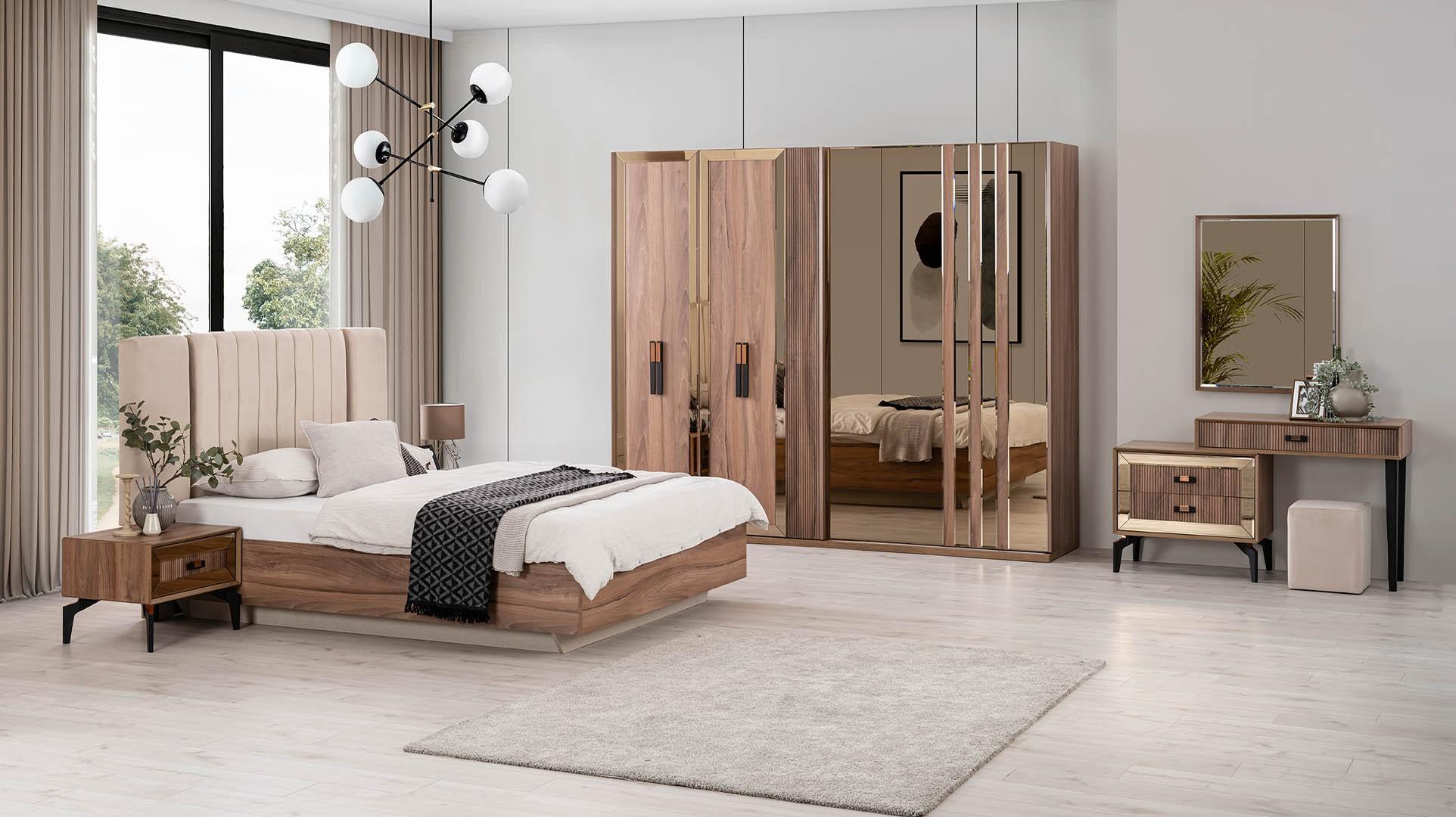 Entdecken Sie Luxus und Stil mit dieser modernen 7-teiligen Doppelbett-Schlafzimmergarnitur in Braun von B2B Moebel! Mit einem Bett, Nachttischen, einem Kleiderschrank, einer Kommode, einem Spiegel und sogar einem Hocker ist dieses Set perfekt für Ihr Schlafzimmer. Hergestellt aus hochwertigem Holz und Stoff, bietet dieses Set nicht nur Eleganz, sondern auch Funktionalität. Die Maße sind ideal für ein großzügiges Bett und passende Möbelstücke. Gönnen Sie sich den Luxus eines eleganten Schlafzimmers mit diesem modernen Set in Braun und setzen Sie einen neuen Akzent in Ihrem Zuhause.