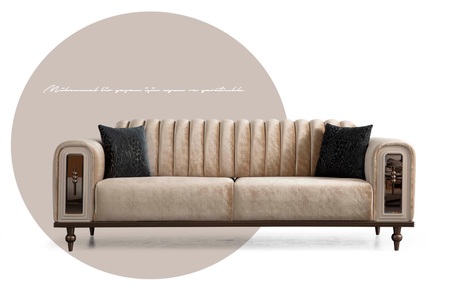 Entspannen Sie in Stil mit unserem Designer Modern Couchgarnitur Sofagarnitur Set Wohnzimmer Set 3+1 in eleganter Beige-Farbe. Hergestellt aus hochwertigem Holz, bietet dieses Set höchsten Komfort und modernes Design für Ihr Zuhause. Der 3-Sitzer hat die Maße 235 x 85 x 90 cm und der Sessel misst 86 x 83 x 70 cm, beide mit einer angenehmen Sitzhöhe von ca. 44 cm und Sitztiefe von ca. 56 cm. Verleihen Sie Ihrem Wohnzimmer eine stilvolle Note mit diesem zeitlosen Möbelstück. (Andere Farben auf Anfrage erhältlich)