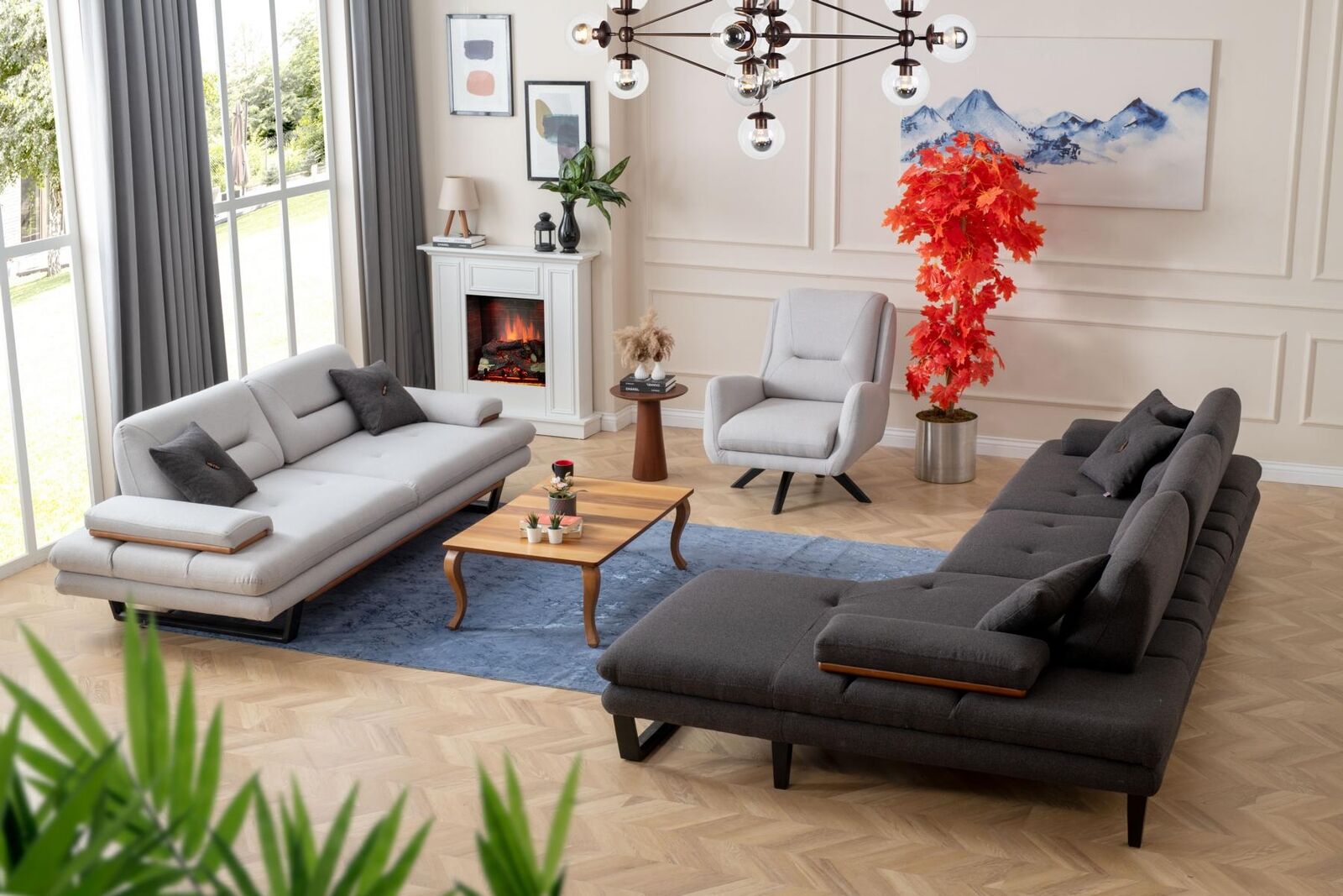 Entdecken Sie unsere moderne Sofagarnitur, bestehend aus einem 3-Sitzer, einem 1-Sitzer und einem Ecksofa in L-Form. Diese Designer Möbelstücke sind neu und bieten höchsten Komfort und Stil für Ihr Zuhause. Das Ecksofa hat Maße von ca. 320 x 180 cm oder 180 x 320 cm und eine Sitzhöhe von ca. 42 cm. Der 3-Sitzer ist etwa 238 x 100 x 77 cm groß und auch der Sessel misst ca. 88 x 80 x 80 cm. Die Farbe entspricht der Abbildung, kann aber auf Anfrage angepasst werden. Hergestellt aus hochwertigen Materialien wie Holz, Textil und Edelstahl, sind diese Möbelstücke von XL Mobel die perfekte Wahl für Ihr Wohnzimmer. Gönnen Sie sich Luxus und Qualität! Warten Sie nicht länger und bestellen Sie noch heute.