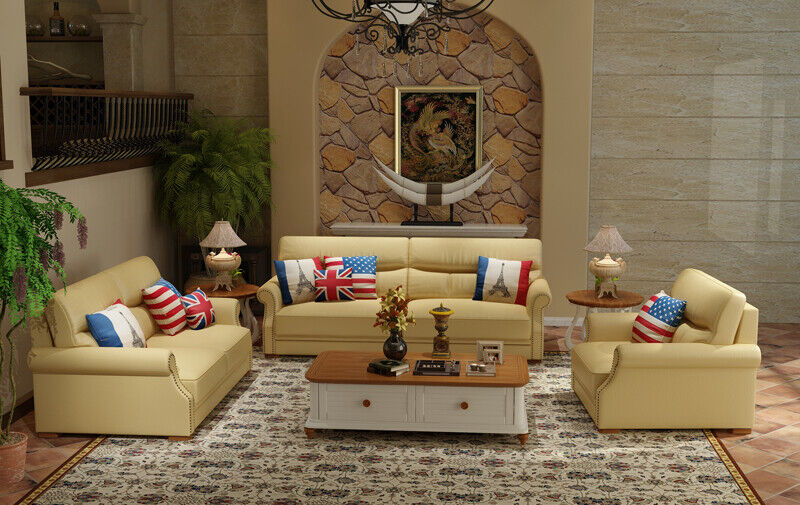 Entdecken Sie die eleganten Sofagarnituren aus unserer Designer-Kollektion für Ihr Wohnzimmer! Die hochwertigen Polstermöbel bestehen aus Premium-Lederfaserstoff (70% Leder / 30% Polyester) und bieten höchsten Komfort. Wählen Sie aus einer Vielzahl von Farben wie Ocker, Azurblau, Terrakotta und vielen mehr. Die Maße der Garnitur sind wie folgt: - Sessel: ca. 96 x 106 x 86 cm - 3-Sitzer Sofa: ca. 196 x 106 x 86 cm Die Sitzhöhe beträgt ca. 43 cm und die Sitztiefe ca. 60 cm für entspanntes Sitzen. Entscheiden Sie sich optional für verschiedene Bezugsgruppen wie Premium Echtleder oder Premium Textilstoff gegen Aufpreis. Das Innengestell aus echtem Holz sorgt für Stabilität und Langlebigkeit. Holen Sie sich jetzt diese stilvolle Sofagarnitur und verleihen Sie Ihrem Wohnzimmer einen Hauch von Luxus!