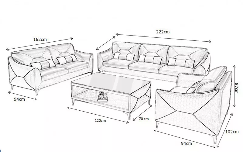Entdecken Sie die moderne Sofa-Sofagarnitur 3+2+1 mit einem stilvollen Couchtisch - die perfekte Ergänzung für Ihr Wohnzimmer! Hergestellt aus hochwertigem Premium-Lederfaserstoff (70% Leder / 30% Polyester) bietet diese Garnitur ein luxuriöses Design und höchsten Komfort. Wählen Sie aus einer Vielzahl von Farben, um Ihr Wohnambiente ganz nach Ihren Wünschen zu gestalten. Die Maße sind wie folgt: - 1 Sitzer: ca. 102 x 94 x 87 cm - 2 Sitzer: ca. 162 x 94 x 87 cm - 3 Sitzer: ca. 222 x 94 x 87 cm - Couchtisch: ca. 120 x 70 x 42 cm Genießen Sie die hohe Qualität des Premium-Lederfaserstoffs und entscheiden Sie optional zwischen verschiedenen Bezugsgruppen, darunter Premium Echtleder aus Italien oder Premium Textilstoff. Das Innengestell aus echtem Holz sorgt für Stabilität und Langlebigkeit. Erleben Sie den Luxus und Komfort dieser exquisiten Sofagarnitur und bringen Sie mit einem stilvollen Farbkonzept frischen Wind in Ihr Zuhause. Gönnen Sie sich dieses hochwertige Möbelstück und lassen Sie sich von seiner Eleganz begeistern!