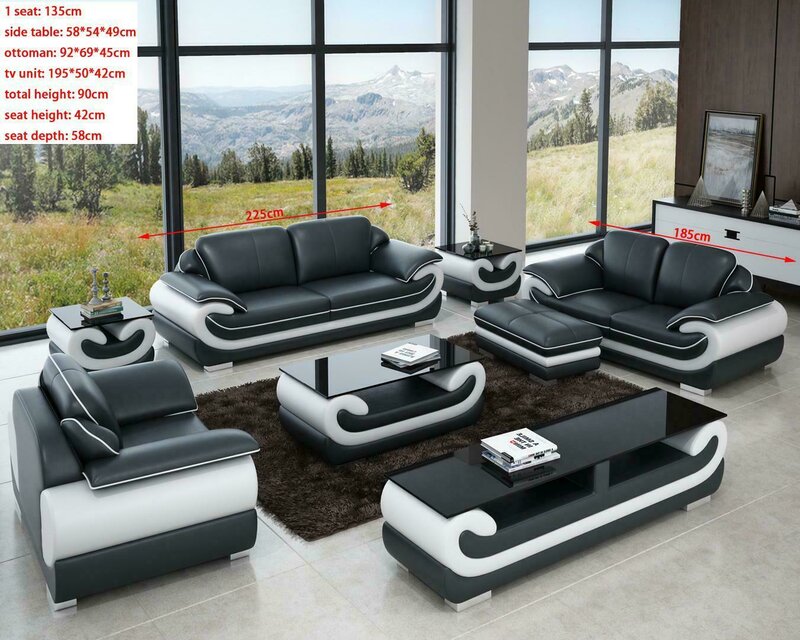 Entspannen Sie in Stil mit unserer exquisiten Relax Sofagarnitur 3+2+1 Sitzer Set Design Sofas Polster Couchen Leder! Hergestellt aus hochwertigem Premium Lederfaserstoff (70% Leder / 30% Polyester) bietet dieses elegante Set von Sofas und Sesseln höchsten Komfort und Qualität. Mit Maßen von ca. 225 x 90 x 95 cm für den 3-Sitzer, ca. 185 x 90 x 95 cm für den 2-Sitzer und ca. 135 x 90 x 95 cm für den Sessel, sowie einer Sitztiefe von ca. 58 cm und einer Sitzhöhe von ca. 42 cm, können Sie sich auf großzügigen Platz zum Entspannen freuen. Das Produkt ist in einer Vielzahl von Farben erhältlich, sodass Sie zwischen Ocker, Safrangelb, Zitronengelb, Marineblau und vielen anderen Farben wählen können. Optional können Sie auch zwischen verschiedenen Materialien wie Premium Echtleder, Textilstoff oder Vollleder wählen, um Ihren persönlichen Stil zu unterstreichen. Das Innengestell aus echtem Holz und der Federkern sorgen für Stabilität und Langlebigkeit. Gönnen Sie sich und Ihrem Zuhause ein Upgrade mit unserer Relax Sofagarnitur!