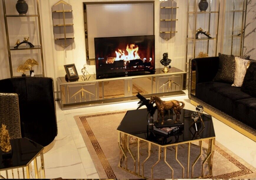 Auf der Suche nach einem luxuriösen und eleganten Möbelstück für dein Wohnzimmer? Dann ist das Luxus Lowboard RTV Regal die perfekte Wahl für dich! Hergestellt aus hochwertigem Holz und in den Maßen ca. 230 x 47 x 45 cm gehalten, bietet dieses Sideboard genügend Stauraum für deine elektronischen Geräte und Accessoires. In einem ansprechenden Design und in der Farbe wie abgebildet, wird dieses Möbelstück zum Blickfang in deinem Zuhause. Hol dir jetzt dieses stilvolle Lowboard und verleihe deinem Wohnzimmer einen Hauch von Luxus!