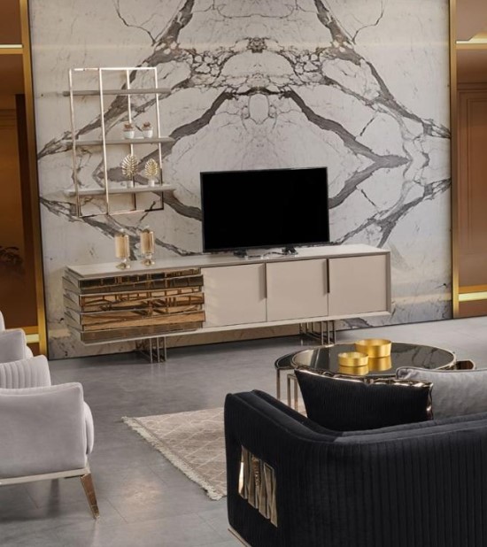 Entdecken Sie den stilvollen RTV Lowboard TV Ständer Sideboard in Beige und Gold aus dem B2B Moebel Wohnzimmer Set! Dieses moderne Set umfasst ein TV-Ständer mit den Maßen ca. 228 cm x 51 cm x 65 cm und Regale mit den Maßen ca. 75 cm x 84 cm x 100 cm. Hergestellt aus hochwertigem Holz, verleiht dieses Möbelstück Ihrem Wohnzimmer einen eleganten Touch. Holen Sie sich jetzt dieses neue Möbelstück für Ihre Unterhaltungsecke!