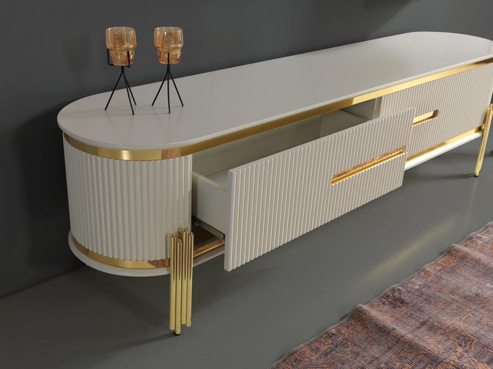 Entdecken Sie den TV Ständer RTV Lowboard in Weiß aus Holz, ein modernes Sideboard für Ihr Wohnzimmer. Mit einer Länge von ca. 208 cm, einer Breite von ca. 45 cm und einer Höhe von ca. 50 cm bietet dieser TV-Ständer viel Platz für Ihre Unterhaltungselektronik. Das schicke Design passt perfekt in jede moderne Wohnzimmerumgebung. Hergestellt aus hochwertigem Holz ist dieses Möbelstück nicht nur funktional, sondern auch stilvoll. Bestellen Sie jetzt und verleihen Sie Ihrem Wohnzimmer einen zeitgemäßen Look!
