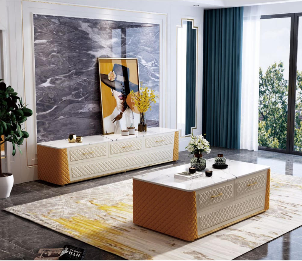 Entdecken Sie das elegante Sideboard TV Lowboard RTV XL Schrank Couchtisch Set in Marmor Imitation von XL Mobel! Dieses stilvolle 2-teilige Set besteht aus einem geräumigen Sideboard und einem passenden Couchtisch, die perfekt in Ihr Wohnzimmer passen. Hergestellt aus hochwertigem Leder, Marmor Imitation, Holz und Edelstahl, verleiht dieses Möbelstück Ihrem Zuhause eine luxuriöse Note. Wählen Sie die passende Größe für Ihre Bedürfnisse und genießen Sie die hohe Qualität und das edle Design. Holen Sie sich jetzt das Sideboard TV Lowboard RTV XL Schrank Couchtisch Set und verwandeln Sie Ihr Wohnzimmer in eine stilvolle Oase!