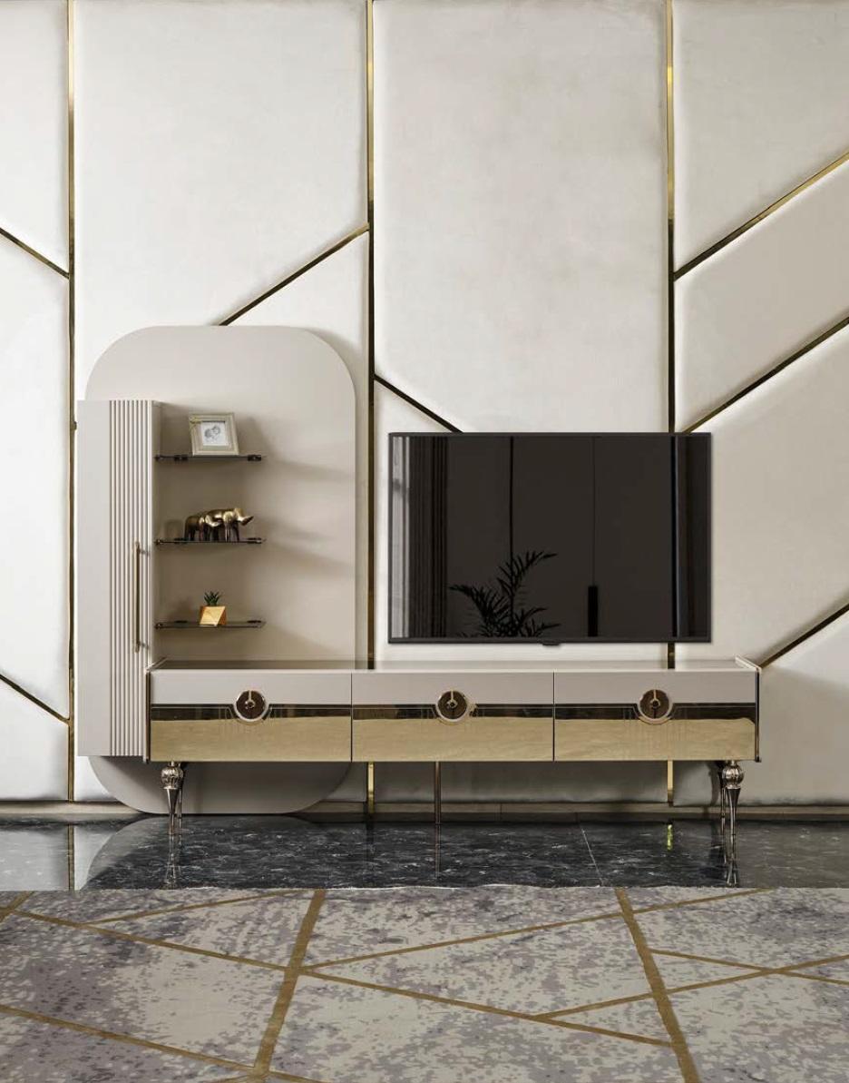 Entdecken Sie die Luxus Wohnwand im italienischen Stil, die Ihrem Wohnzimmer Eleganz verleiht! Mit einem Hauch von Grau und einer Gesamtgröße von ca. 228 x 48 x 171 cm wird diese Wohnwand zum Blickfang in Ihrem Zuhause. Hergestellt aus hochwertigem Holz, vereint sie Funktionalität und Luxus perfekt. Bringen Sie mit diesem TV-Ständer und Sideboard im italienischen Stil Eleganz und Stil in Ihr Wohnzimmer!