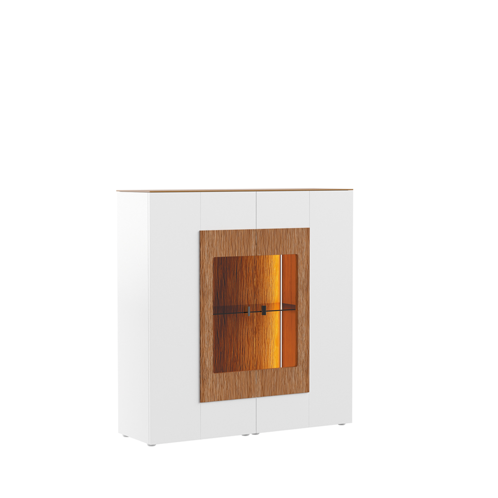 Rückwand & Einlegeböden: MDF (Mitteldichte Holzfaserplatte), furniert & lackiert
